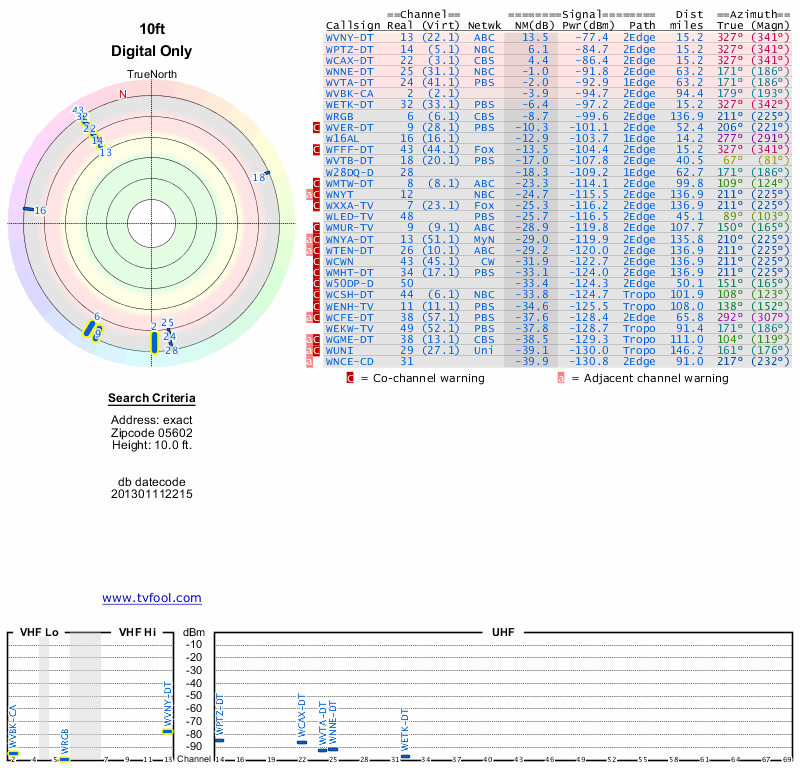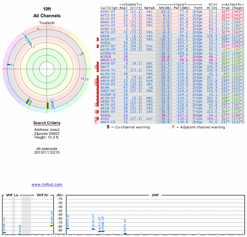 Here are the results for your location. The transmitter database was last updated on June 7, 2013. For more information about these plots and how to interpret them, please check out the Signal Analysis FAQ.