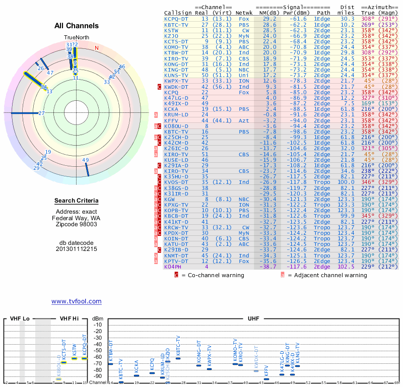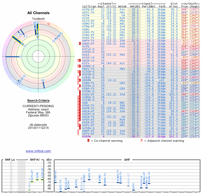 Here are the results for your location. The transmitter database was last updated on June 7, 2013. For more information about these plots and how to interpret them, please check out the Signal Analysis FAQ.
