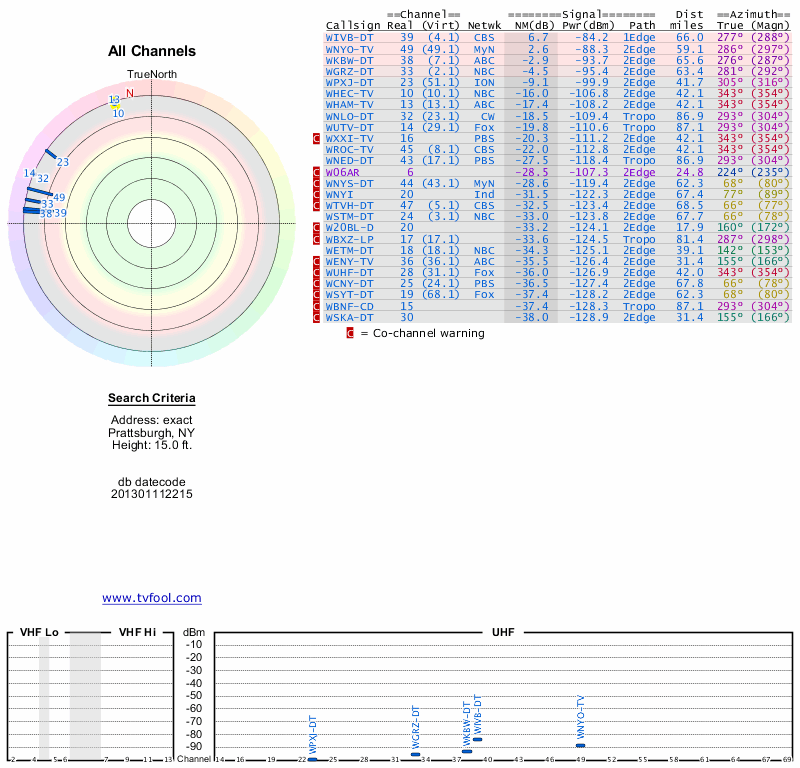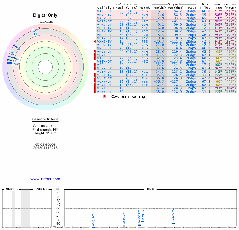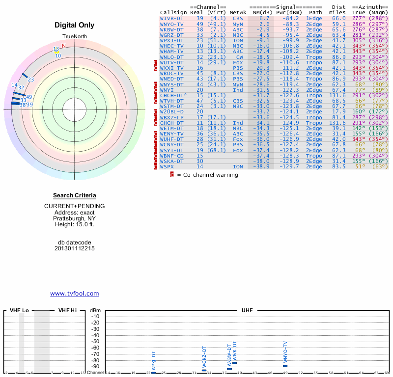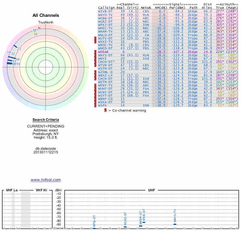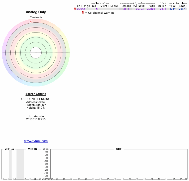 Here are the results for your location. The transmitter database was last updated on June 7, 2013. For more information about these plots and how to interpret them, please check out the Signal Analysis FAQ.