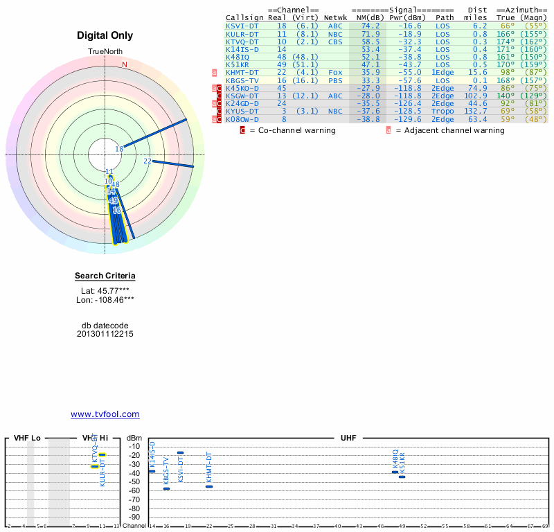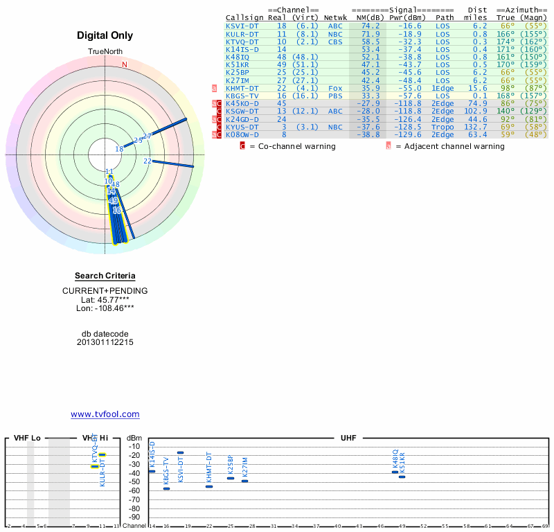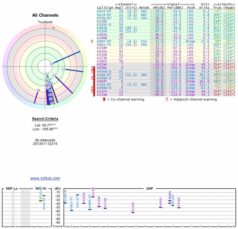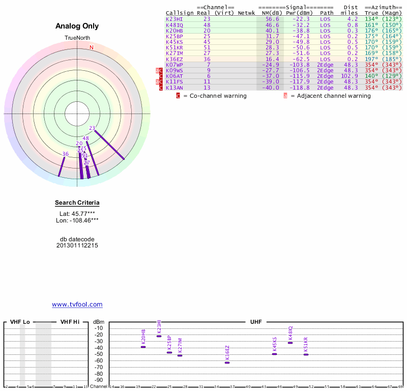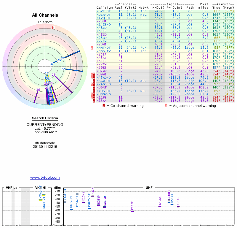 Here are the results for your location. The transmitter database was last updated on June 7, 2013. For more information about these plots and how to interpret them, please check out the Signal Analysis FAQ.