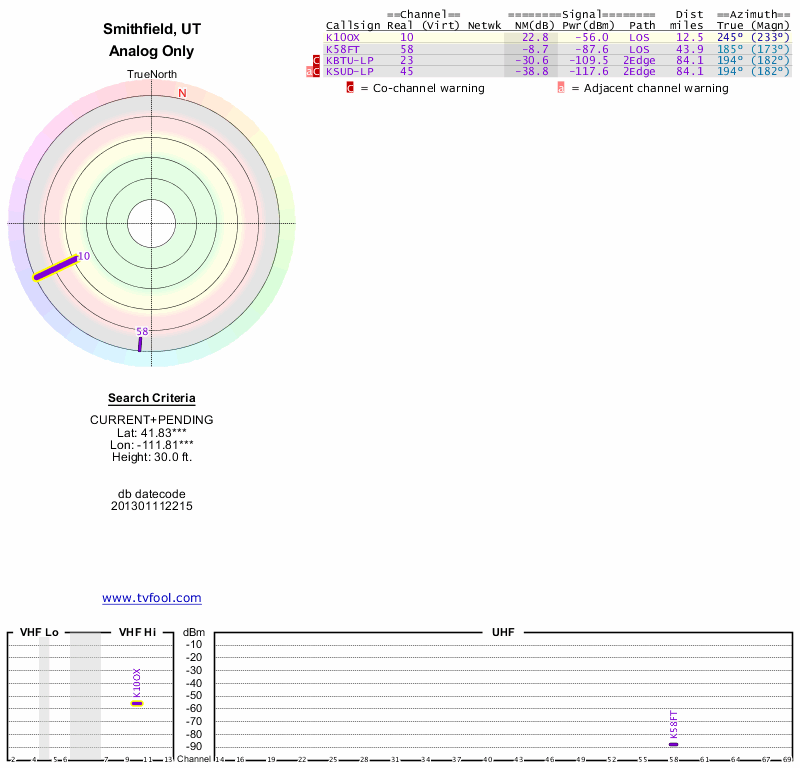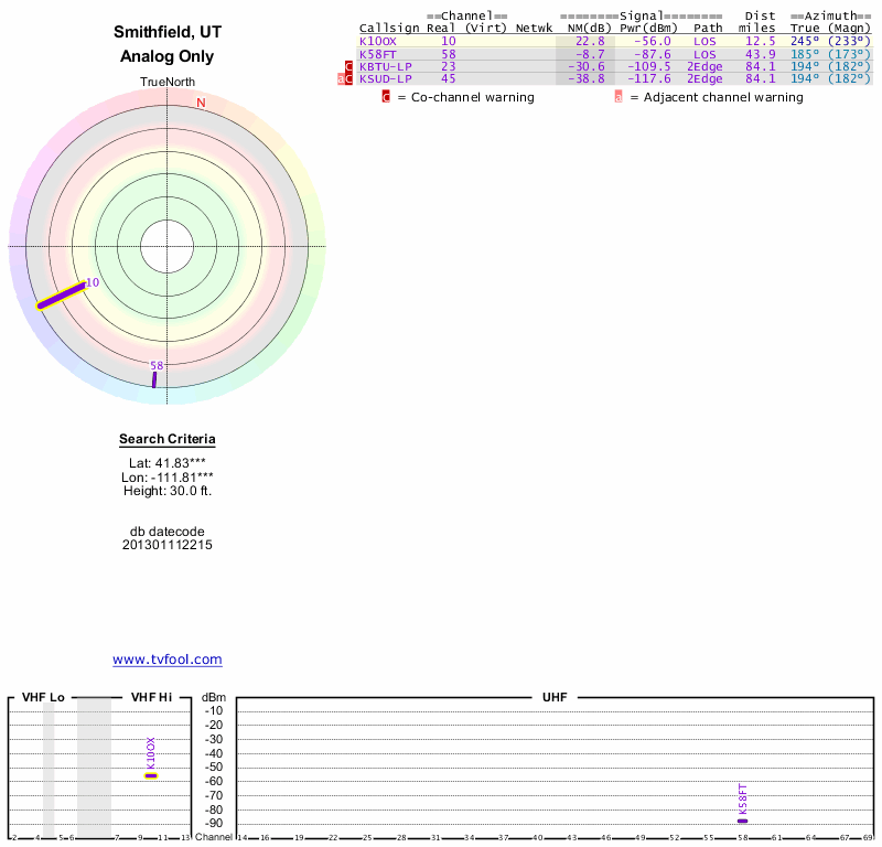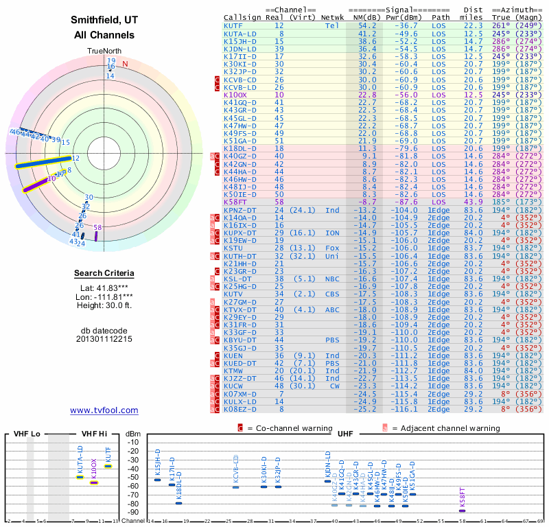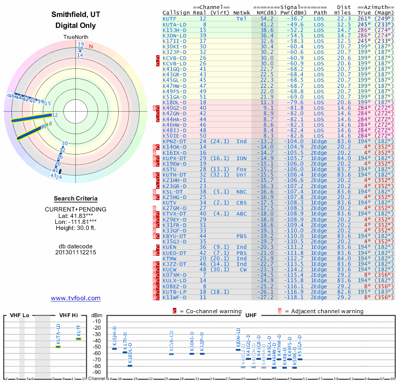 Here are the results for your location. The transmitter database was last updated on June 7, 2013. For more information about these plots and how to interpret them, please check out the Signal Analysis FAQ.