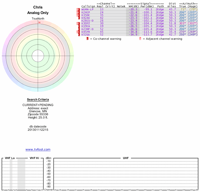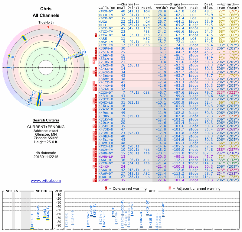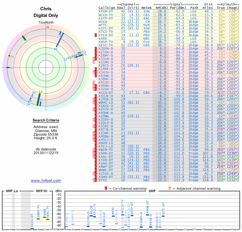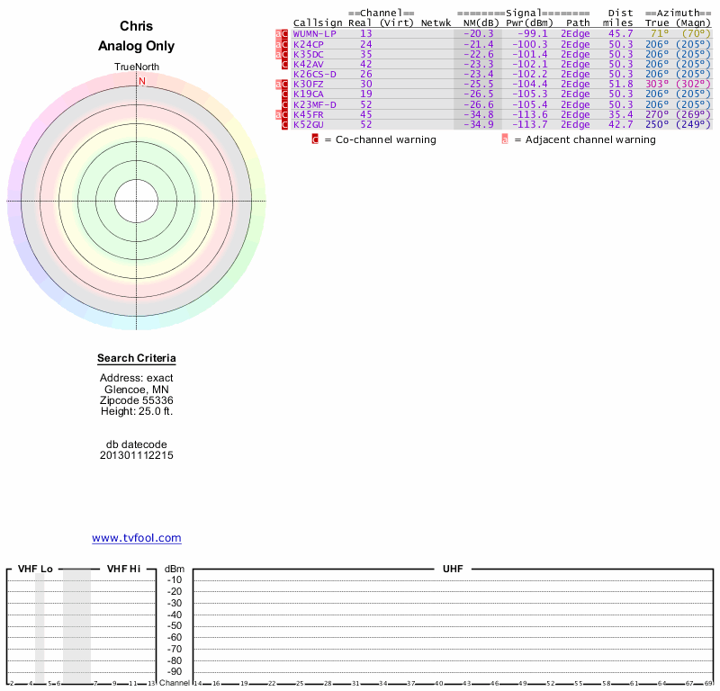 Here are the results for your location. The transmitter database was last updated on June 7, 2013. For more information about these plots and how to interpret them, please check out the Signal Analysis FAQ.