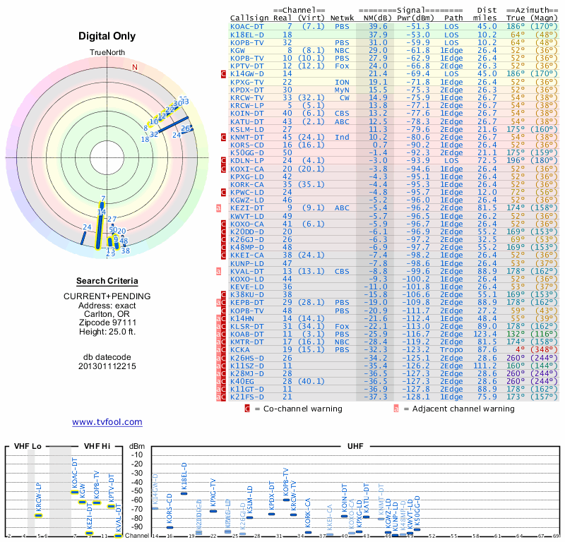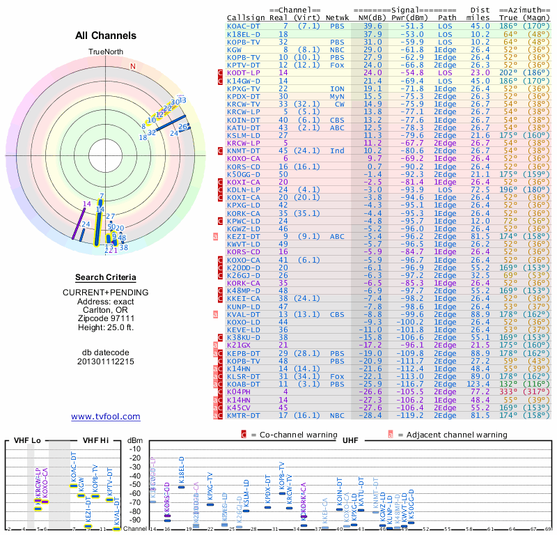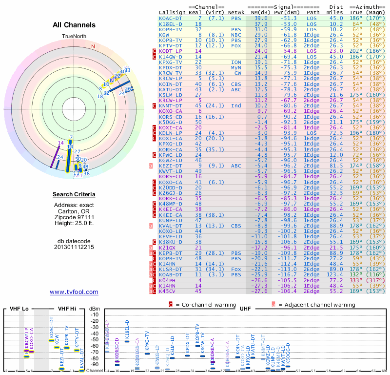 Here are the results for your location. The transmitter database was last updated on June 7, 2013. For more information about these plots and how to interpret them, please check out the Signal Analysis FAQ.