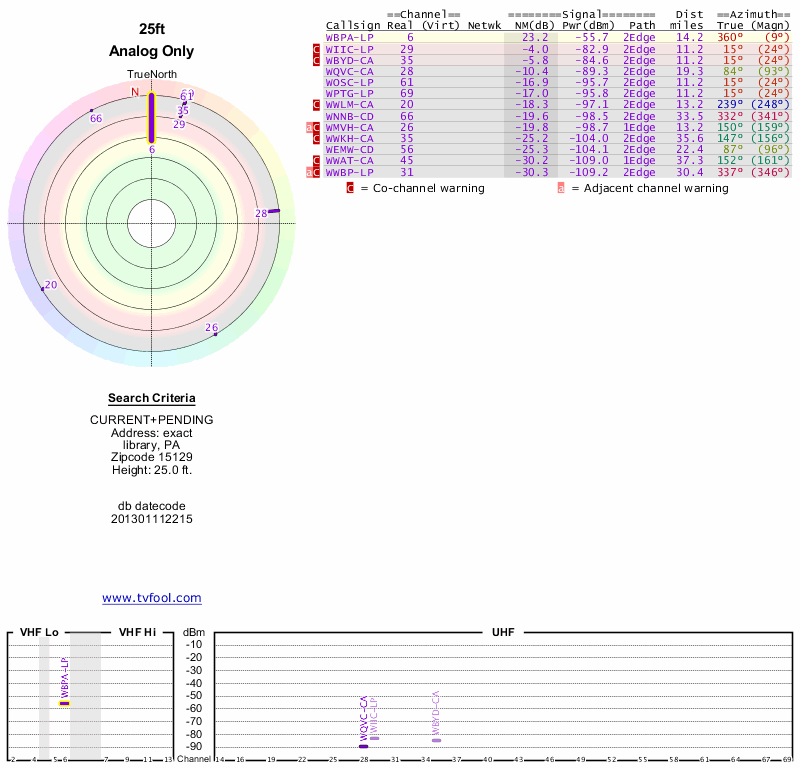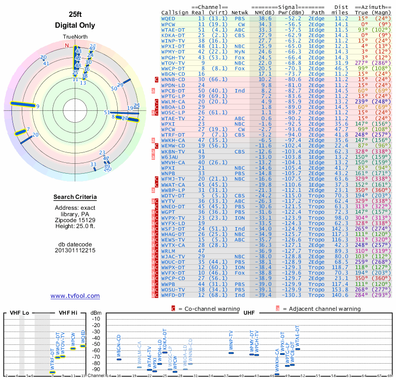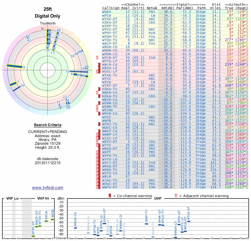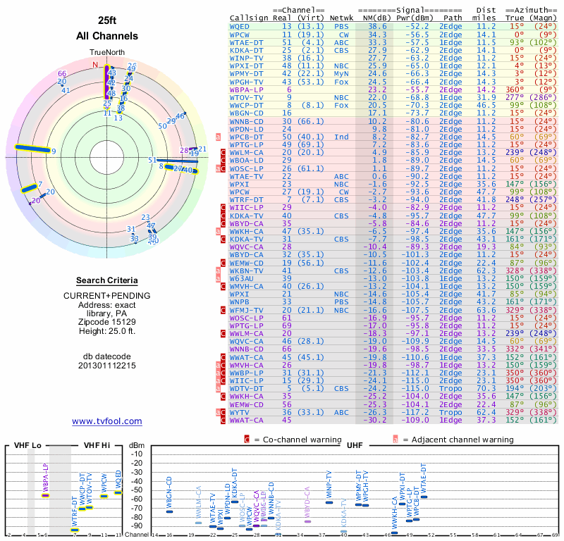 Here are the results for your location. The transmitter database was last updated on June 7, 2013. For more information about these plots and how to interpret them, please check out the Signal Analysis FAQ.