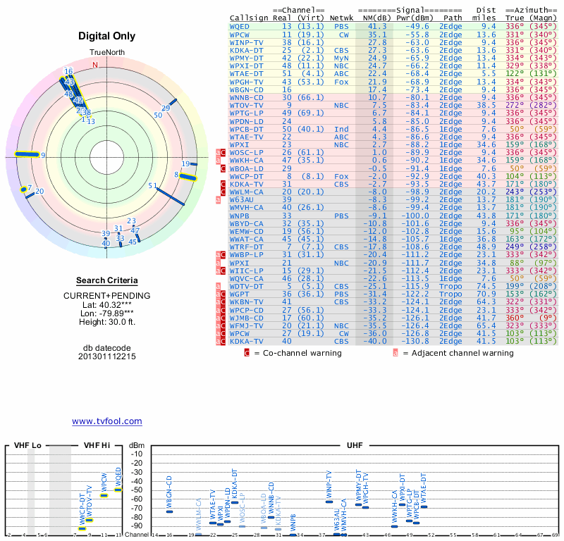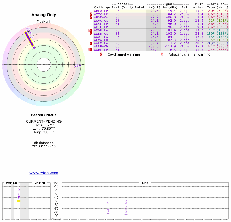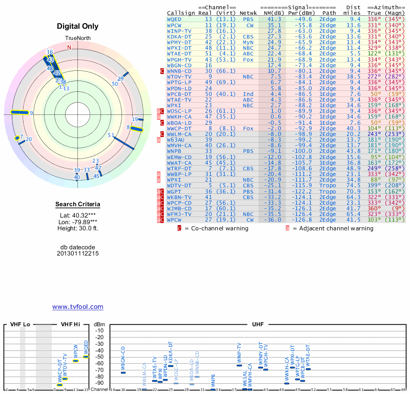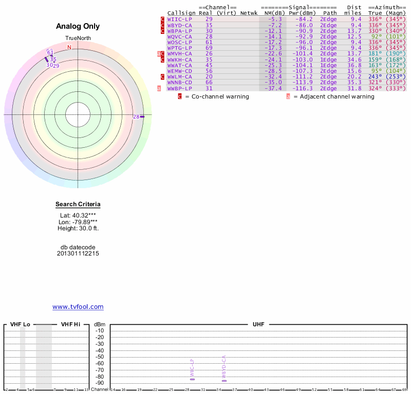 Here are the results for your location. The transmitter database was last updated on June 7, 2013. For more information about these plots and how to interpret them, please check out the Signal Analysis FAQ.