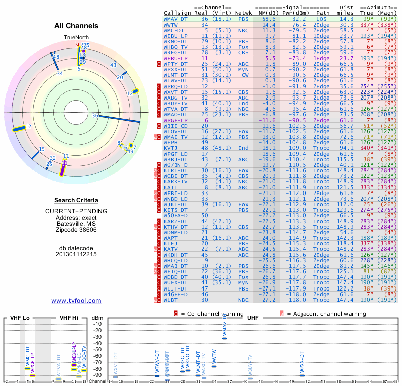 Here are the results for your location. The transmitter database was last updated on June 7, 2013. For more information about these plots and how to interpret them, please check out the Signal Analysis FAQ.