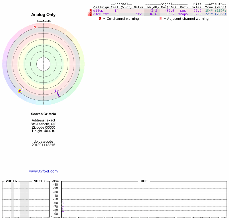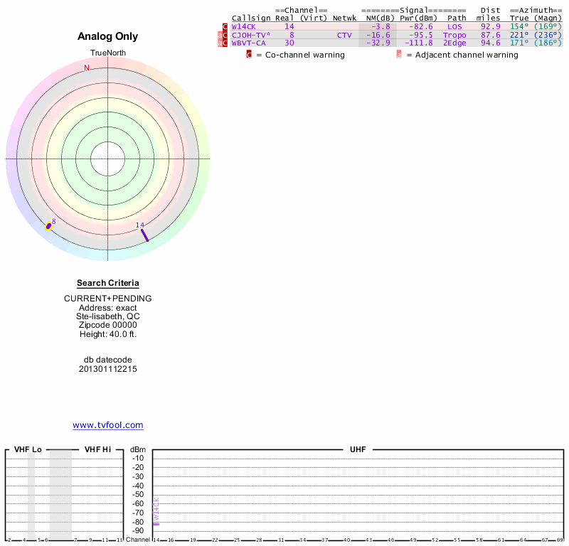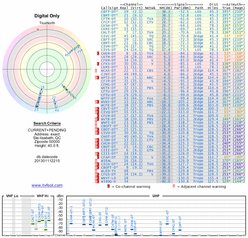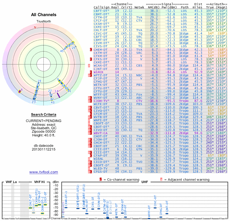 Here are the results for your location. The transmitter database was last updated on June 7, 2013. For more information about these plots and how to interpret them, please check out the Signal Analysis FAQ.
