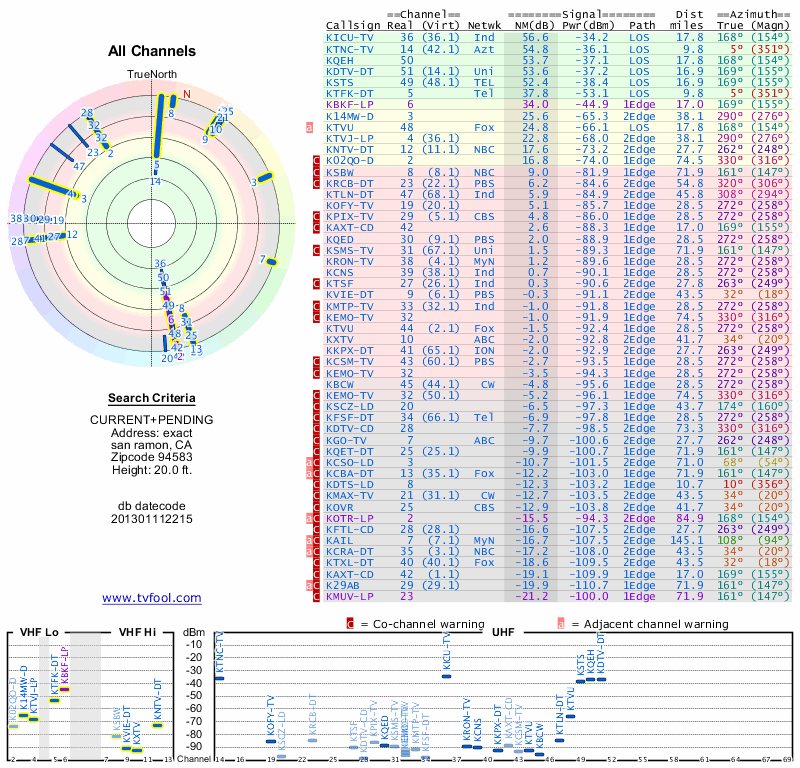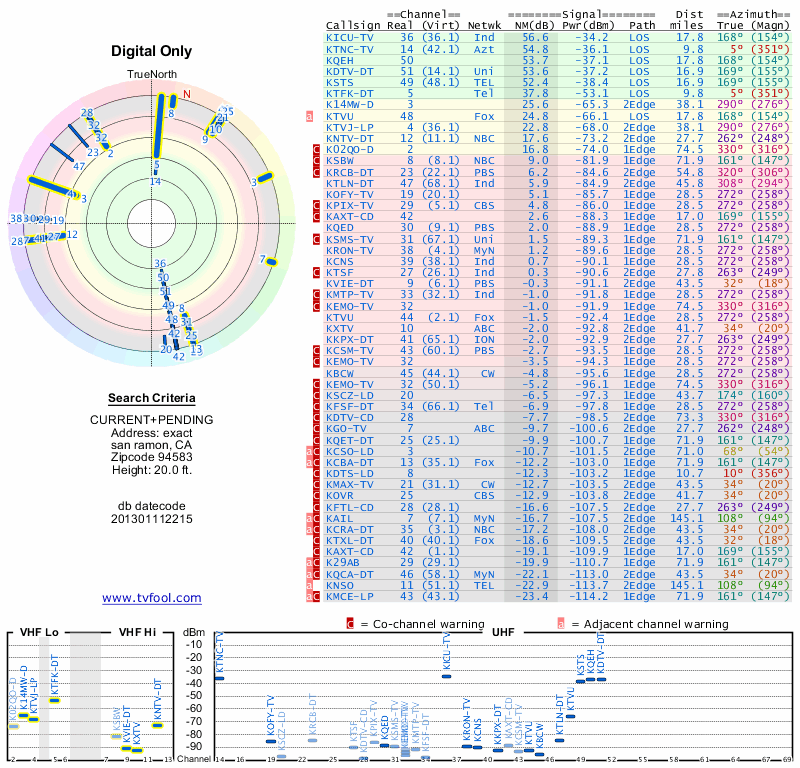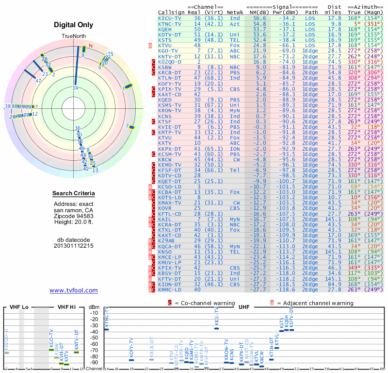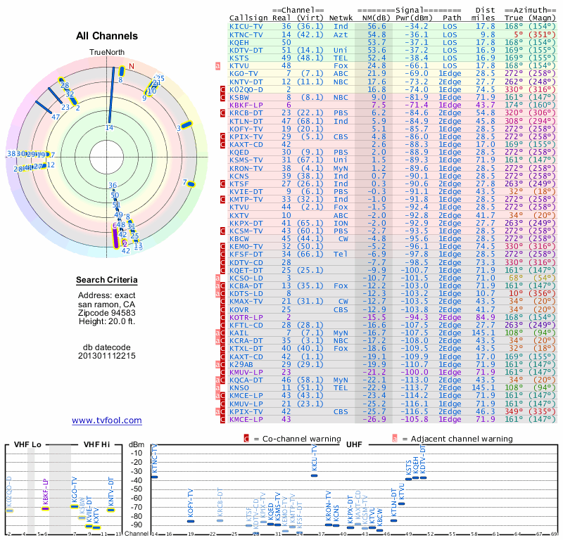 Here are the results for your location. The transmitter database was last updated on June 7, 2013. For more information about these plots and how to interpret them, please check out the Signal Analysis FAQ.