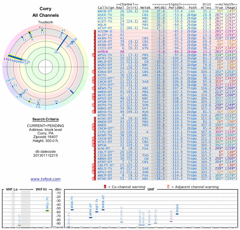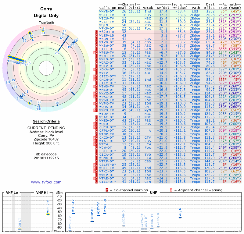 Here are the results for your location. The transmitter database was last updated on June 7, 2013. For more information about these plots and how to interpret them, please check out the Signal Analysis FAQ.