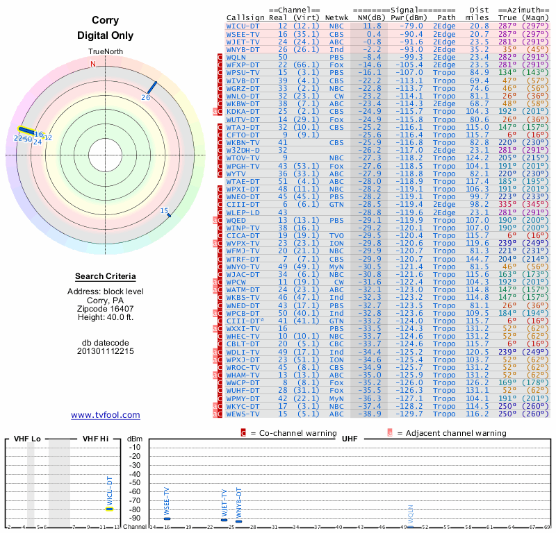 Here are the results for your location. The transmitter database was last updated on June 7, 2013. For more information about these plots and how to interpret them, please check out the Signal Analysis FAQ.