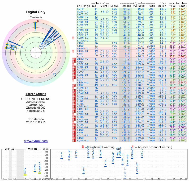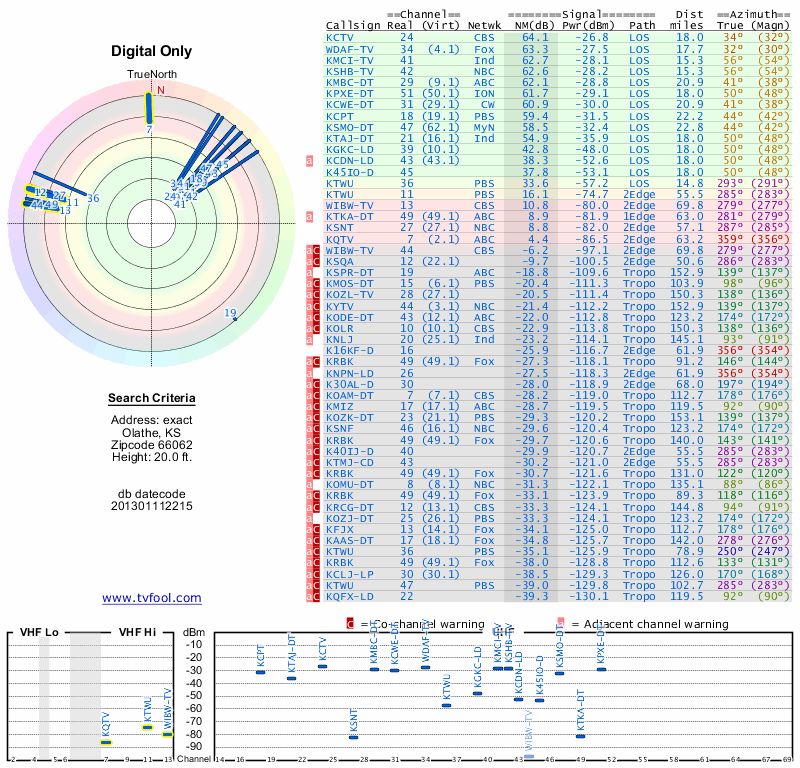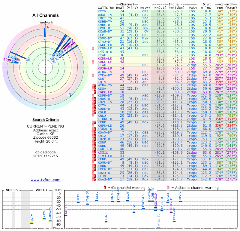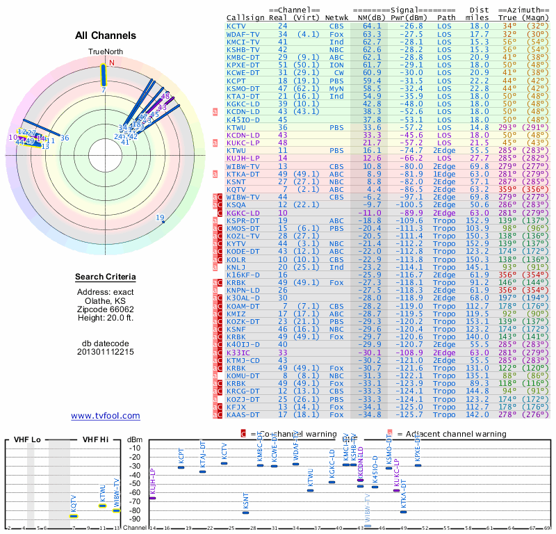 Here are the results for your location. The transmitter database was last updated on June 7, 2013. For more information about these plots and how to interpret them, please check out the Signal Analysis FAQ.
