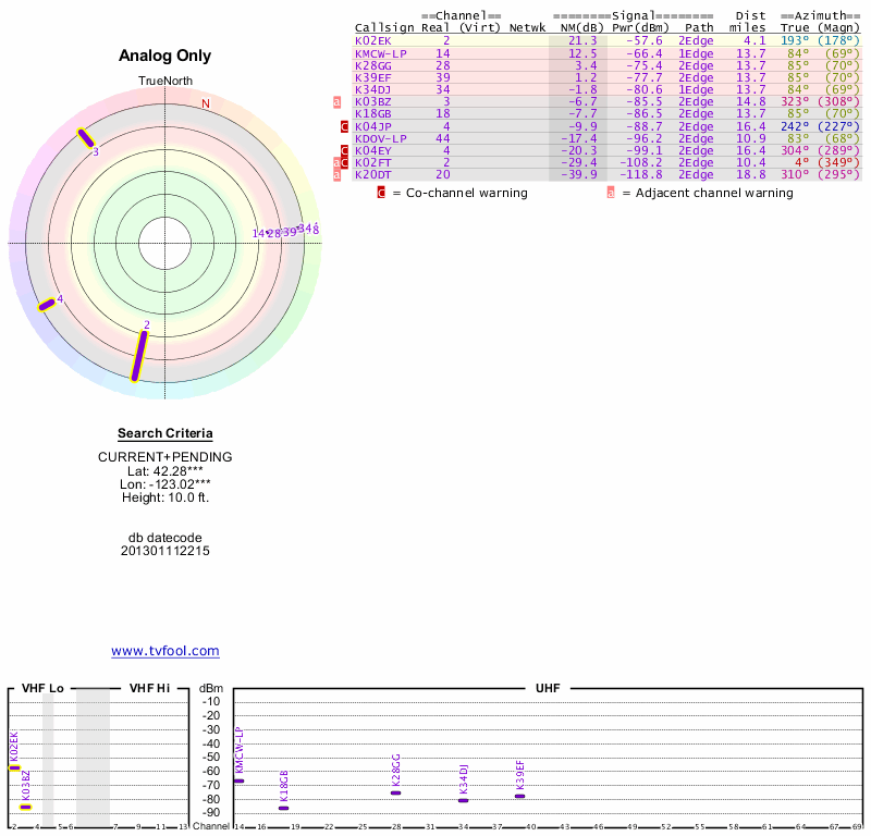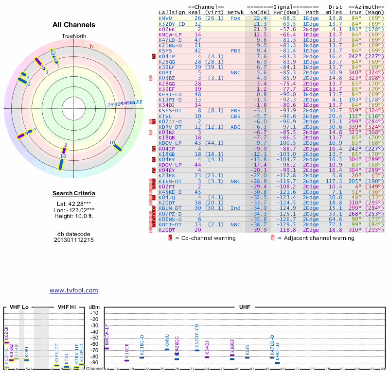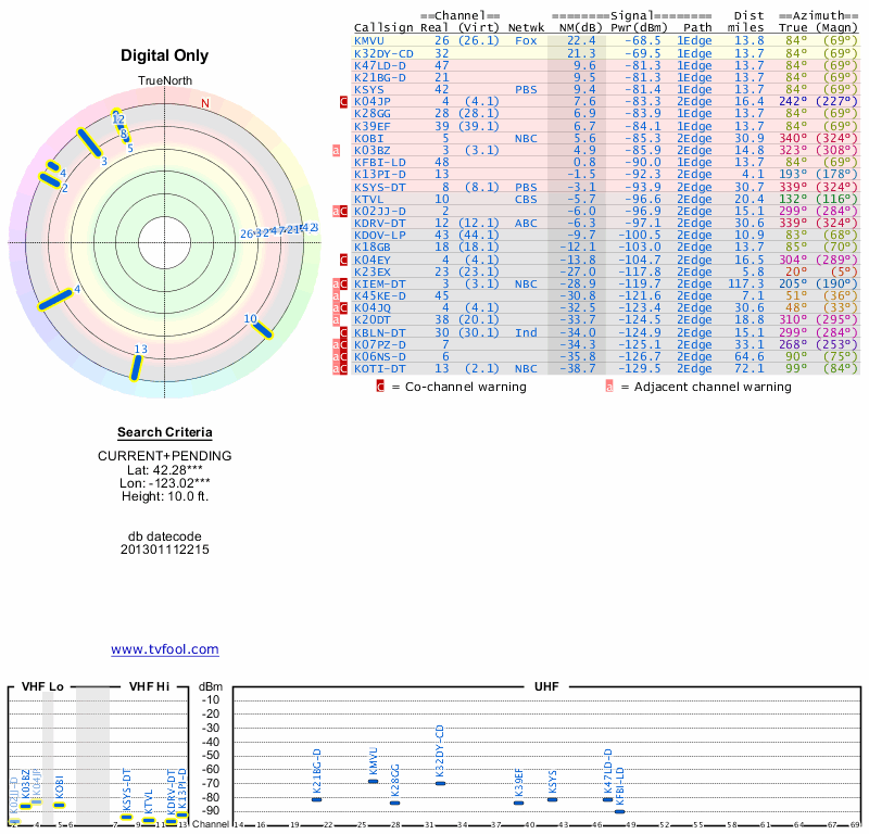 Here are the results for your location. The transmitter database was last updated on June 7, 2013. For more information about these plots and how to interpret them, please check out the Signal Analysis FAQ.