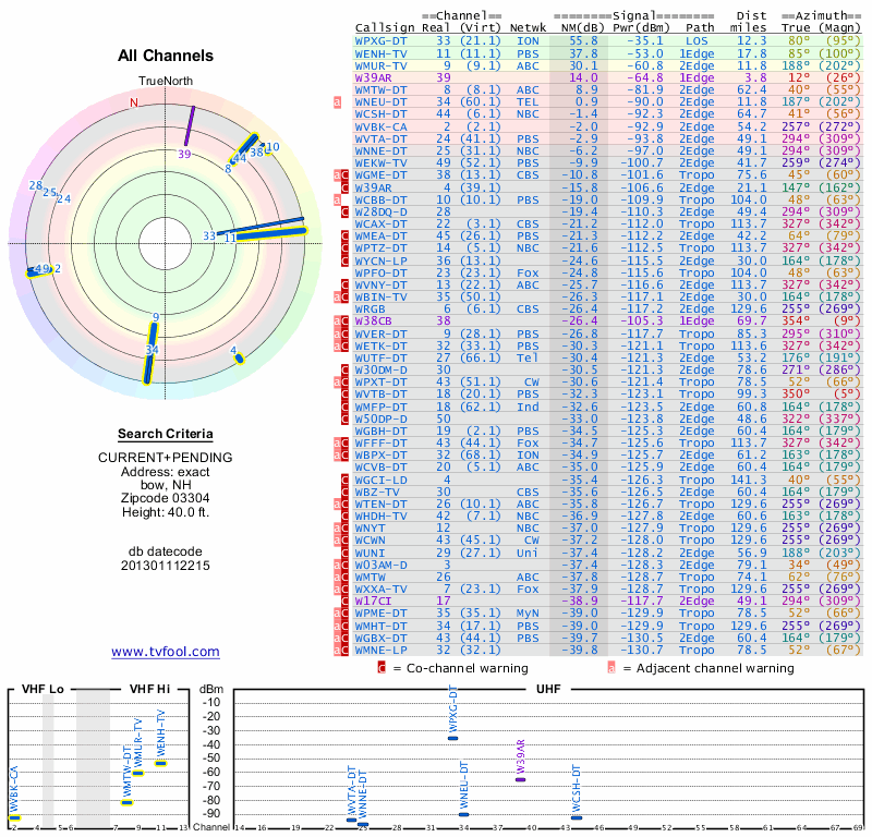 Here are the results for your location. The transmitter database was last updated on June 7, 2013. For more information about these plots and how to interpret them, please check out the Signal Analysis FAQ.