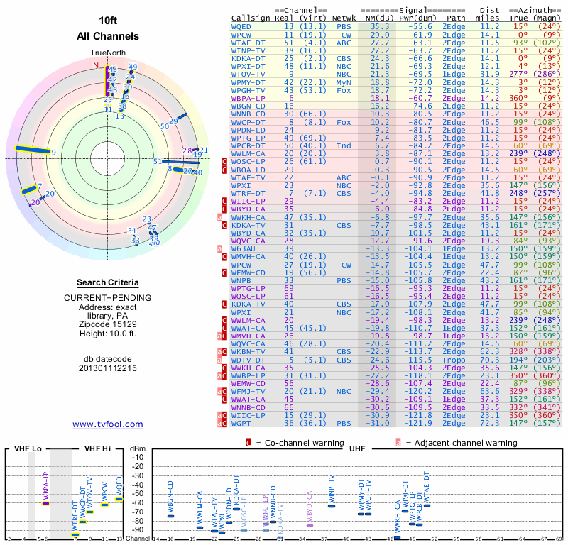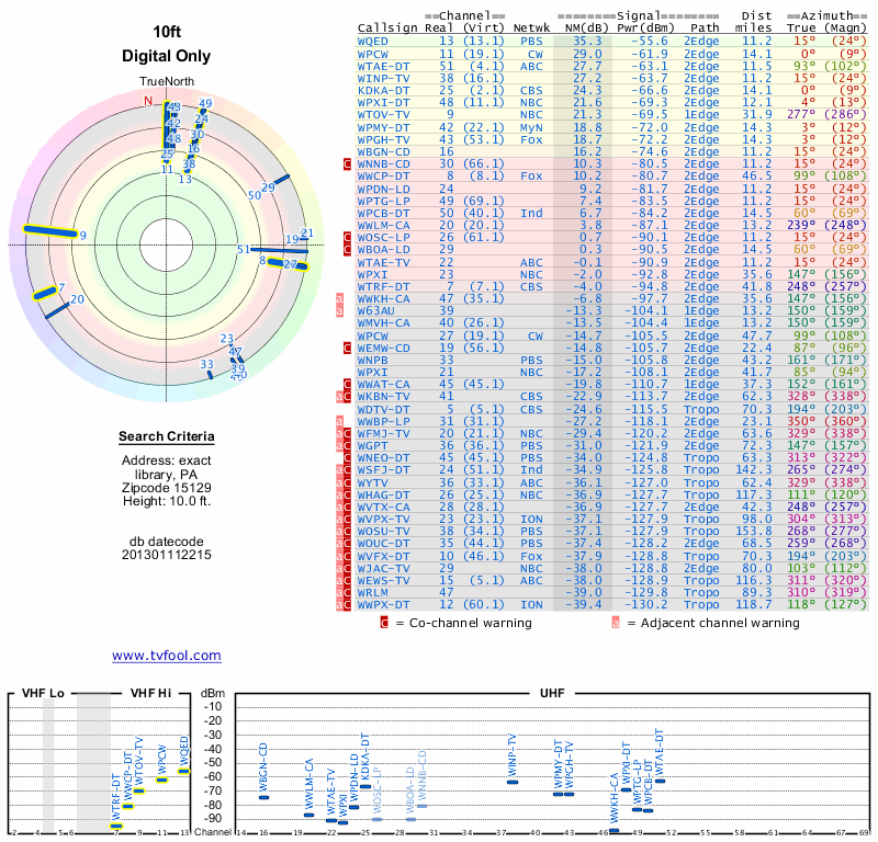 Here are the results for your location. The transmitter database was last updated on June 7, 2013. For more information about these plots and how to interpret them, please check out the Signal Analysis FAQ.
