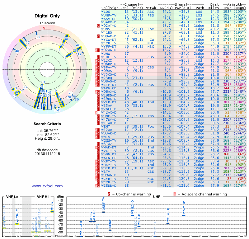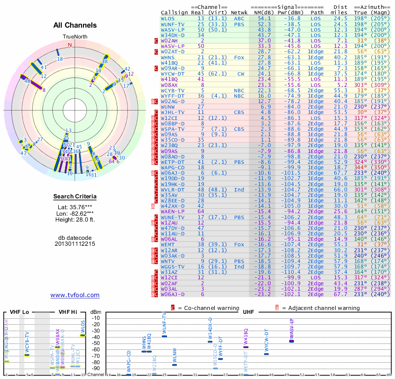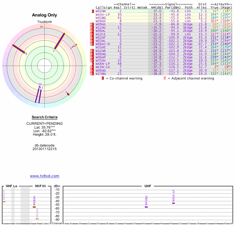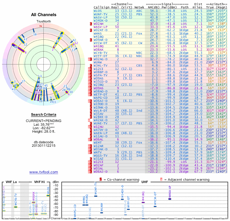 Here are the results for your location. The transmitter database was last updated on June 7, 2013. For more information about these plots and how to interpret them, please check out the Signal Analysis FAQ.
