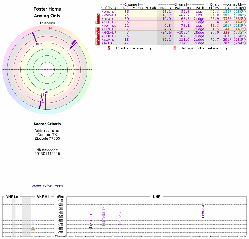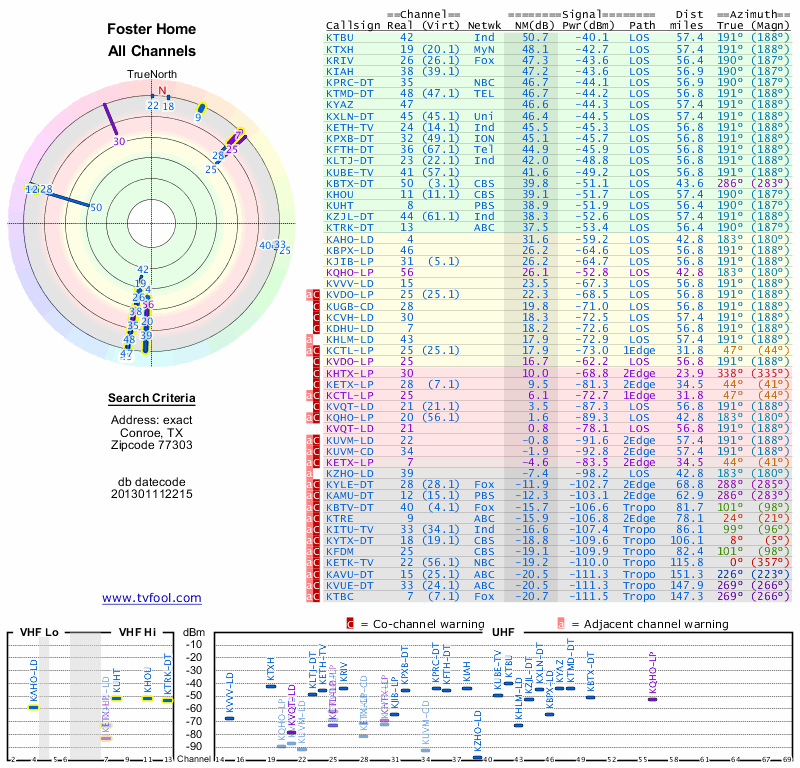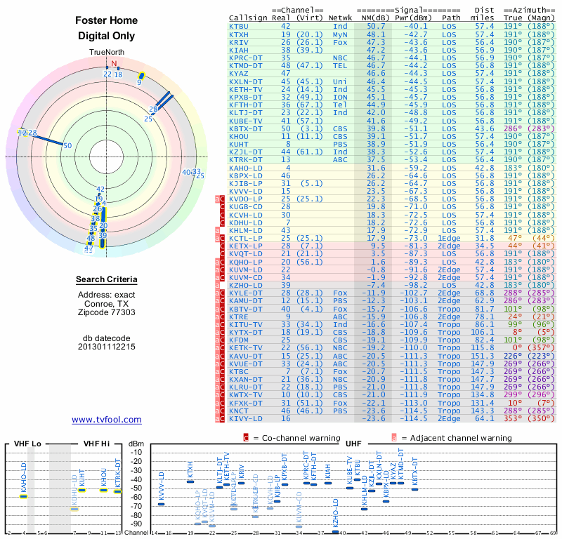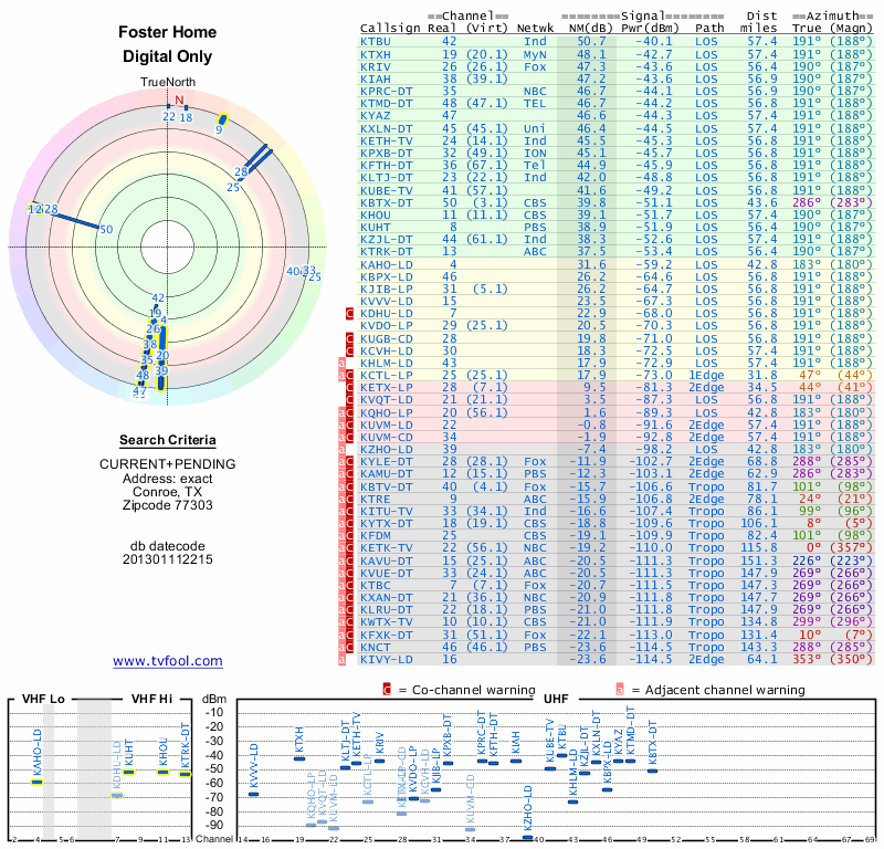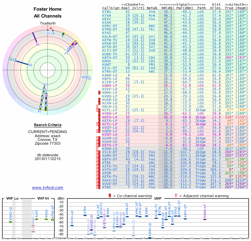 Here are the results for your location. The transmitter database was last updated on June 7, 2013. For more information about these plots and how to interpret them, please check out the Signal Analysis FAQ.