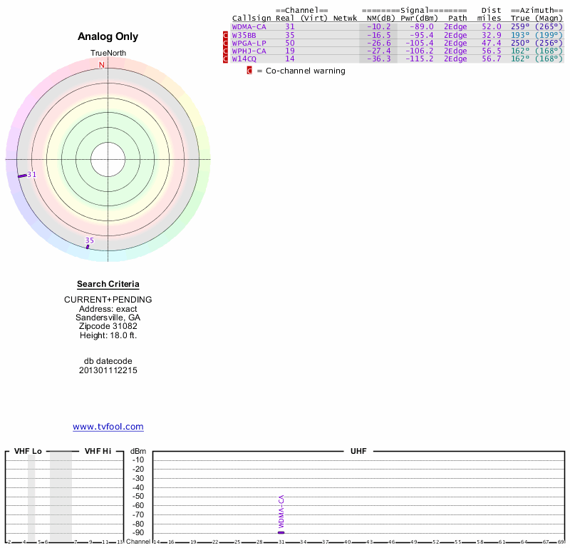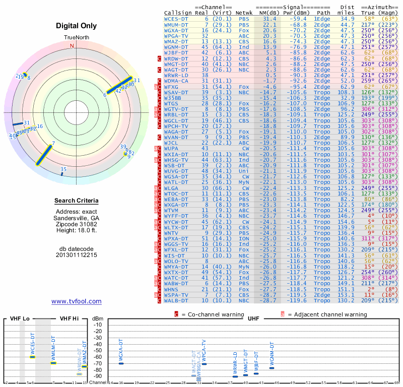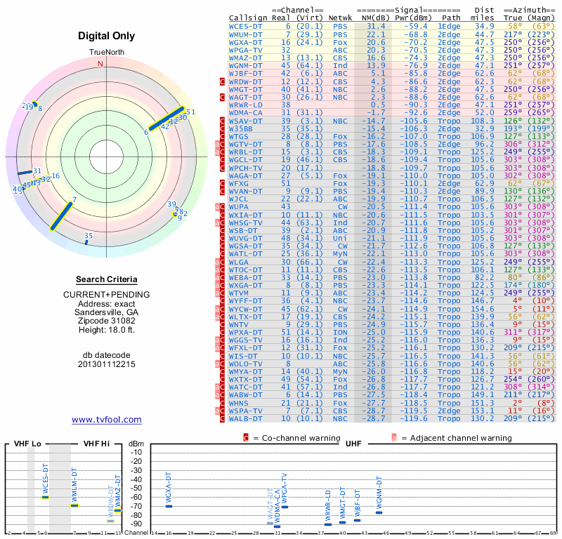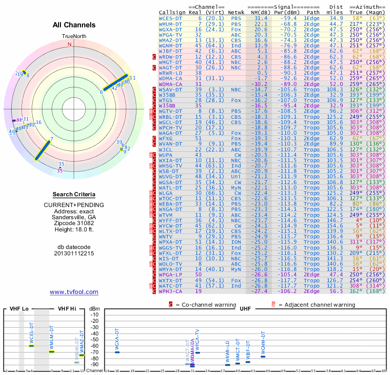 Here are the results for your location. The transmitter database was last updated on June 7, 2013. For more information about these plots and how to interpret them, please check out the Signal Analysis FAQ.