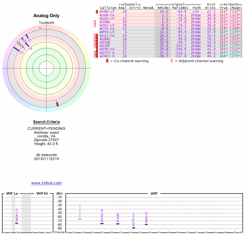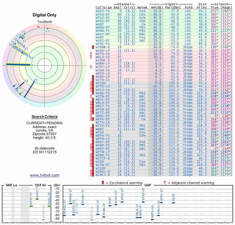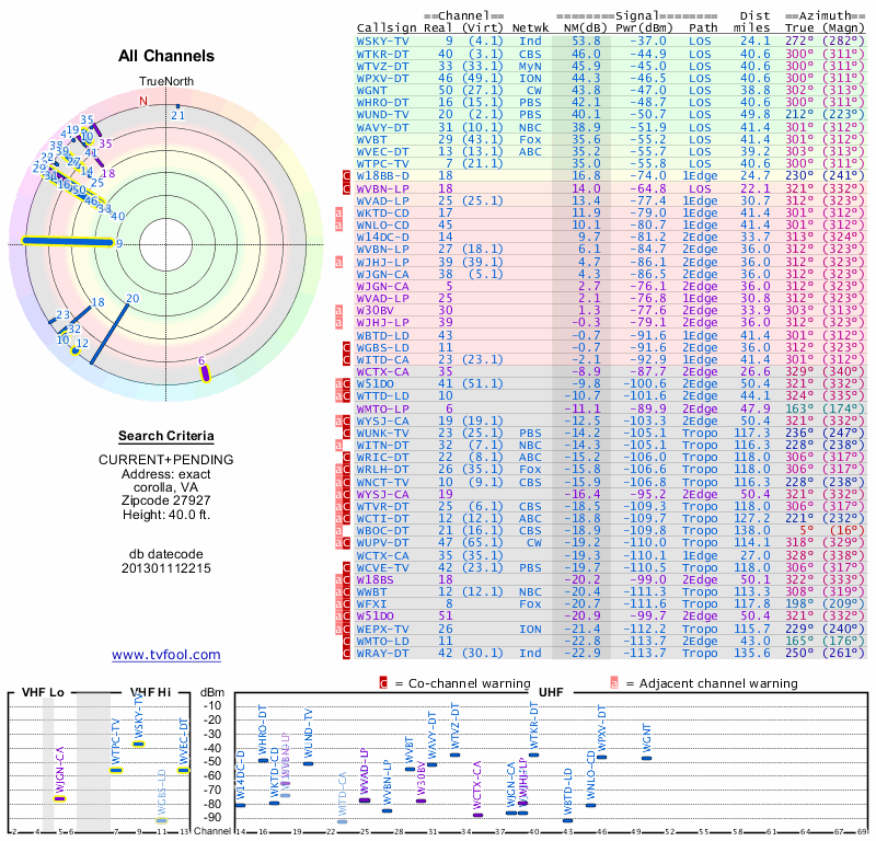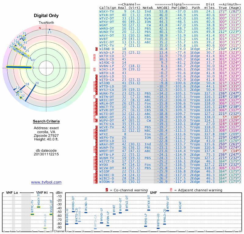 Here are the results for your location. The transmitter database was last updated on June 7, 2013. For more information about these plots and how to interpret them, please check out the Signal Analysis FAQ.