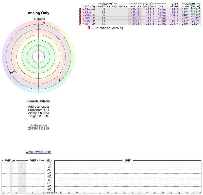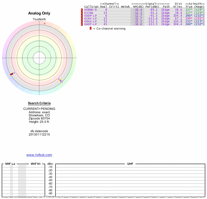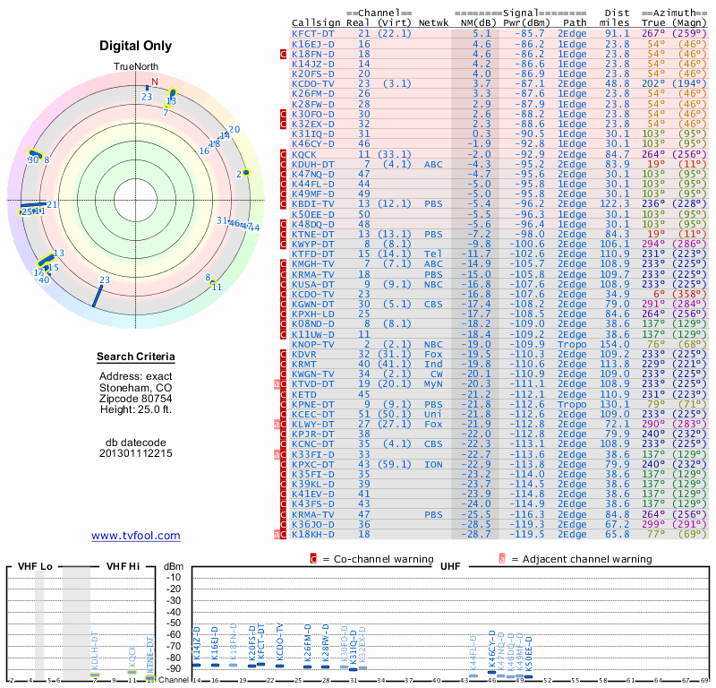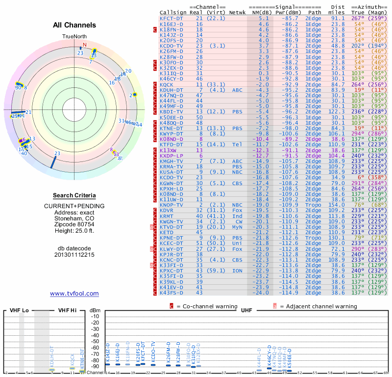 Here are the results for your location. The transmitter database was last updated on June 7, 2013. For more information about these plots and how to interpret them, please check out the Signal Analysis FAQ.