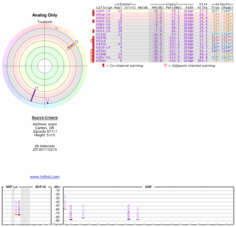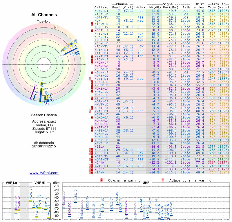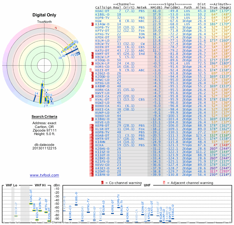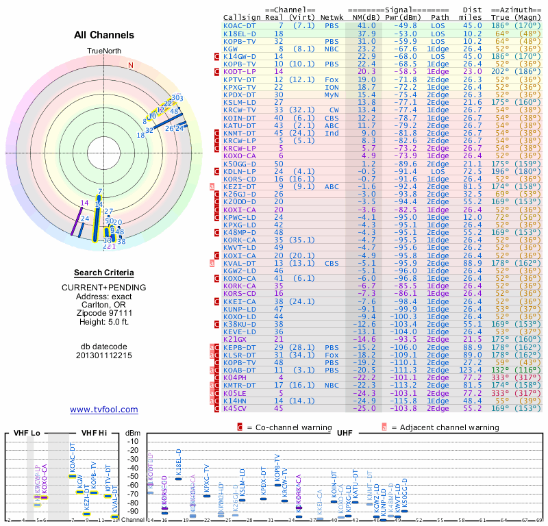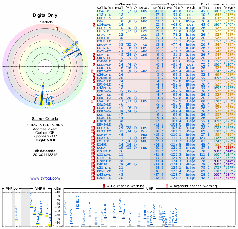 Here are the results for your location. The transmitter database was last updated on June 7, 2013. For more information about these plots and how to interpret them, please check out the Signal Analysis FAQ.