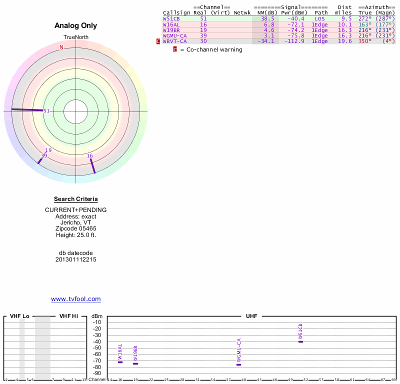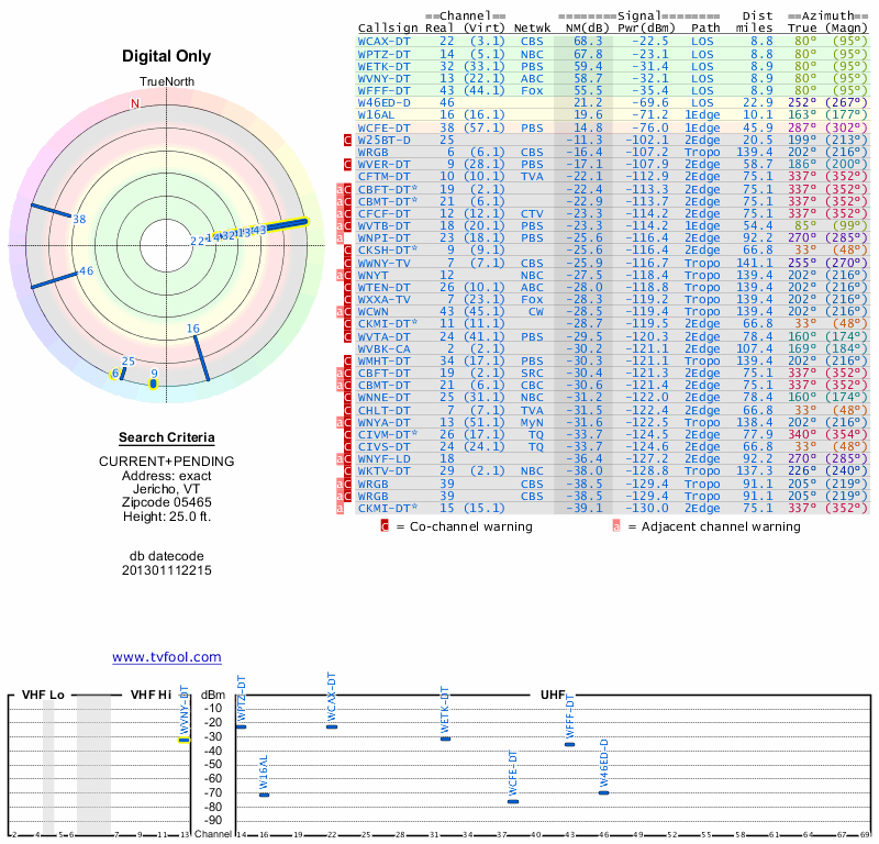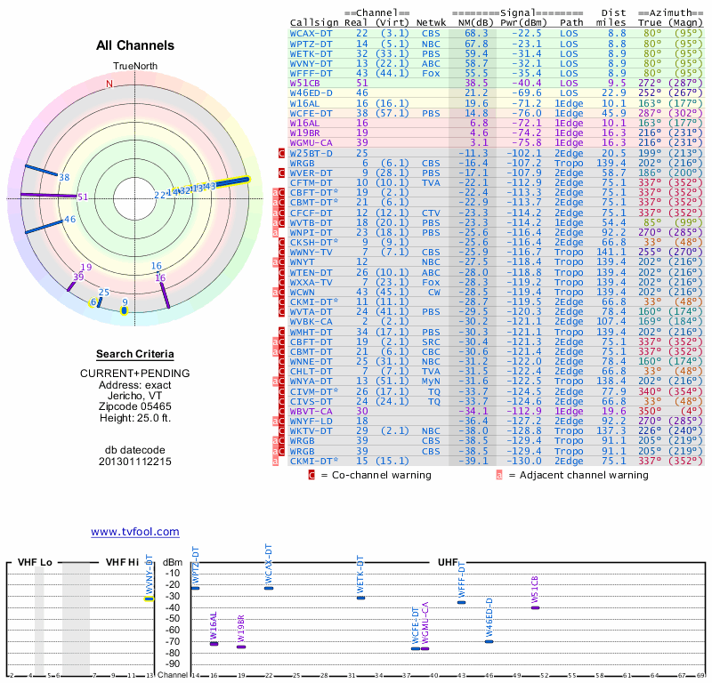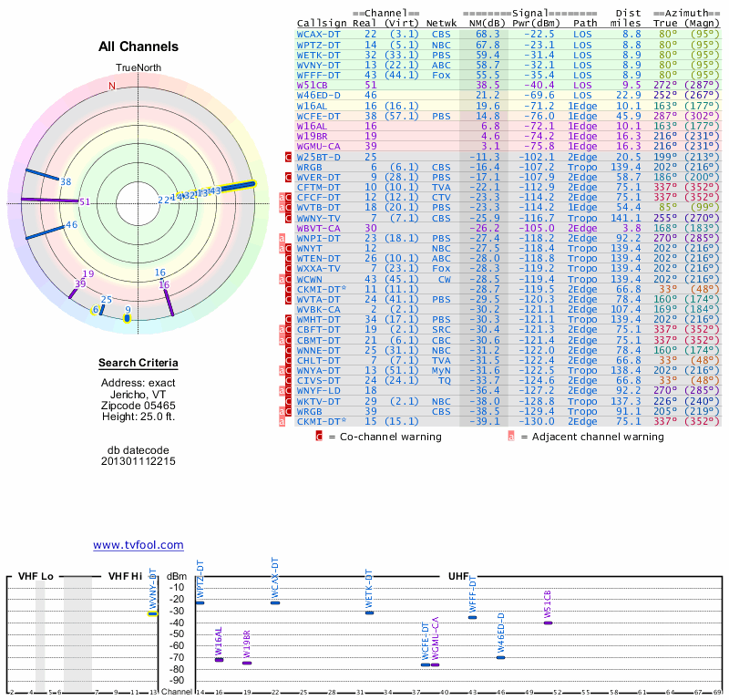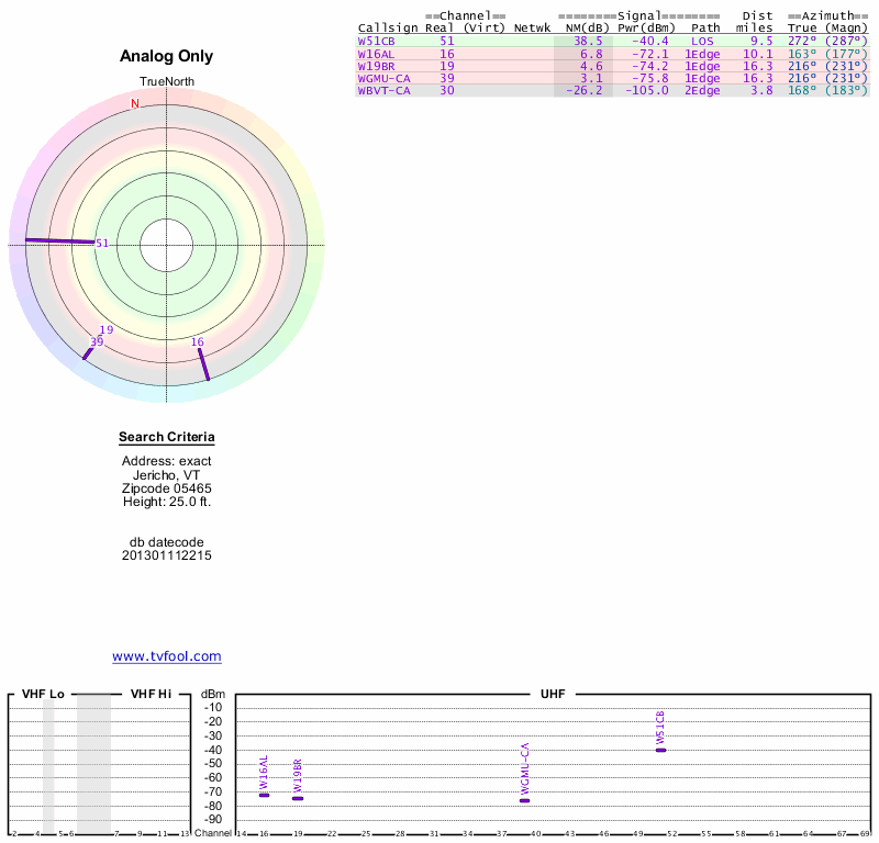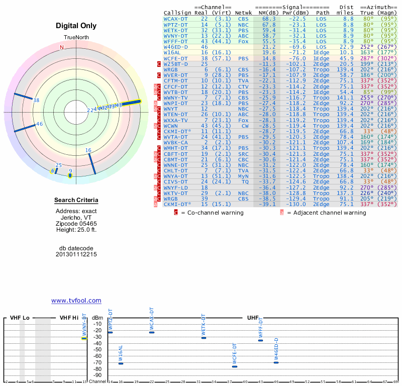 Here are the results for your location. The transmitter database was last updated on June 7, 2013. For more information about these plots and how to interpret them, please check out the Signal Analysis FAQ.