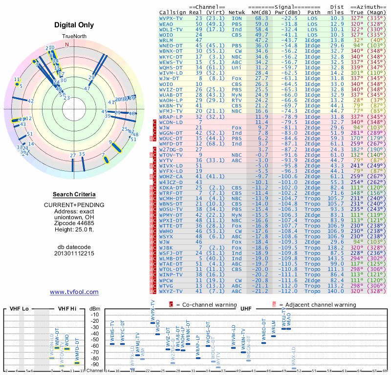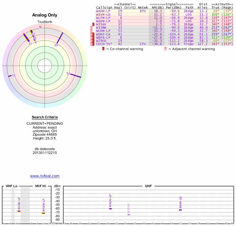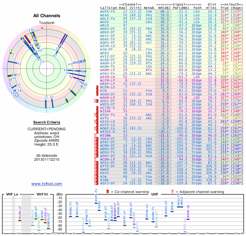 Here are the results for your location. The transmitter database was last updated on June 7, 2013. For more information about these plots and how to interpret them, please check out the Signal Analysis FAQ.