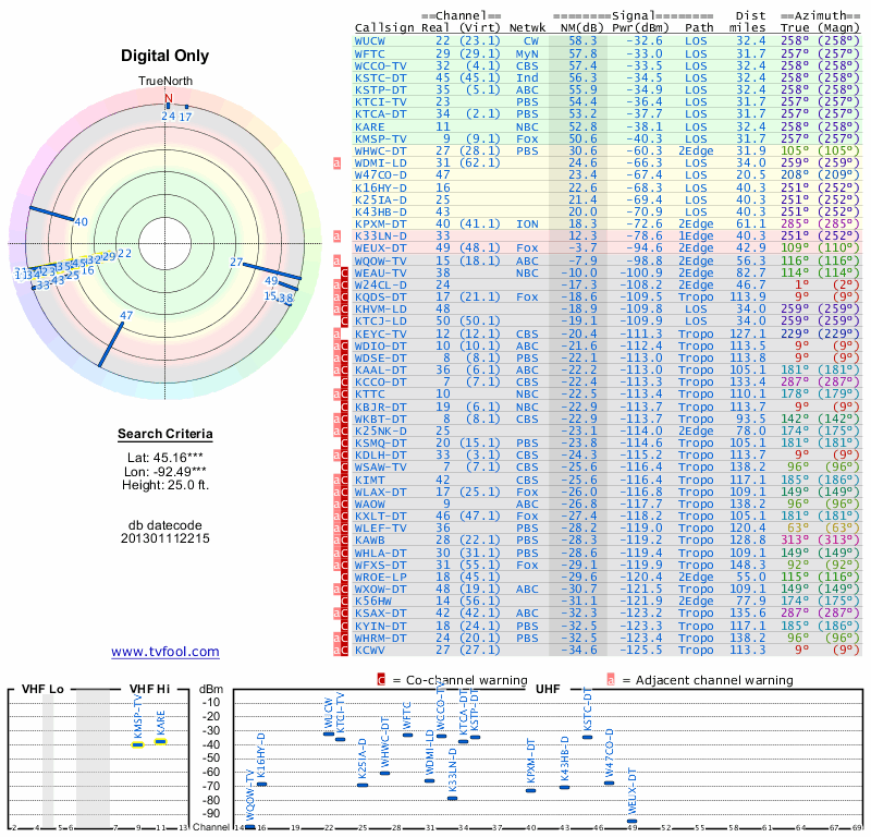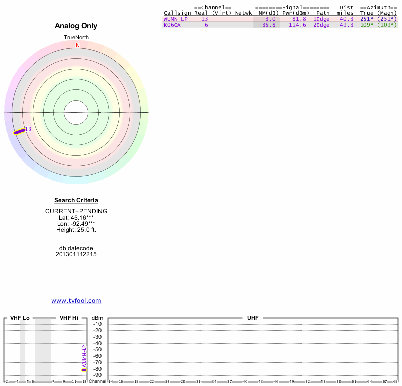 Here are the results for your location. The transmitter database was last updated on June 7, 2013. For more information about these plots and how to interpret them, please check out the Signal Analysis FAQ.