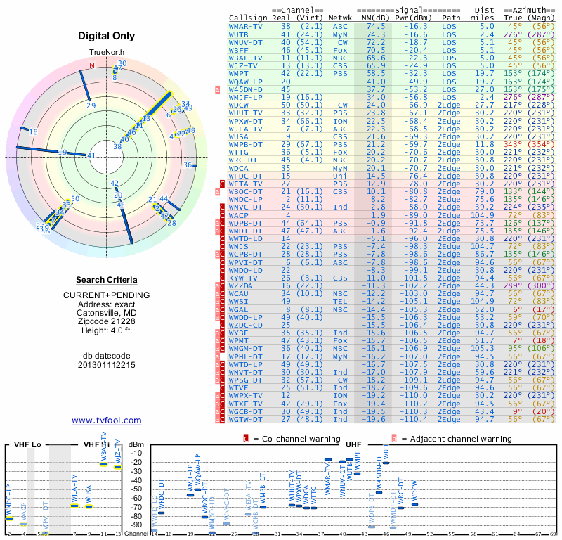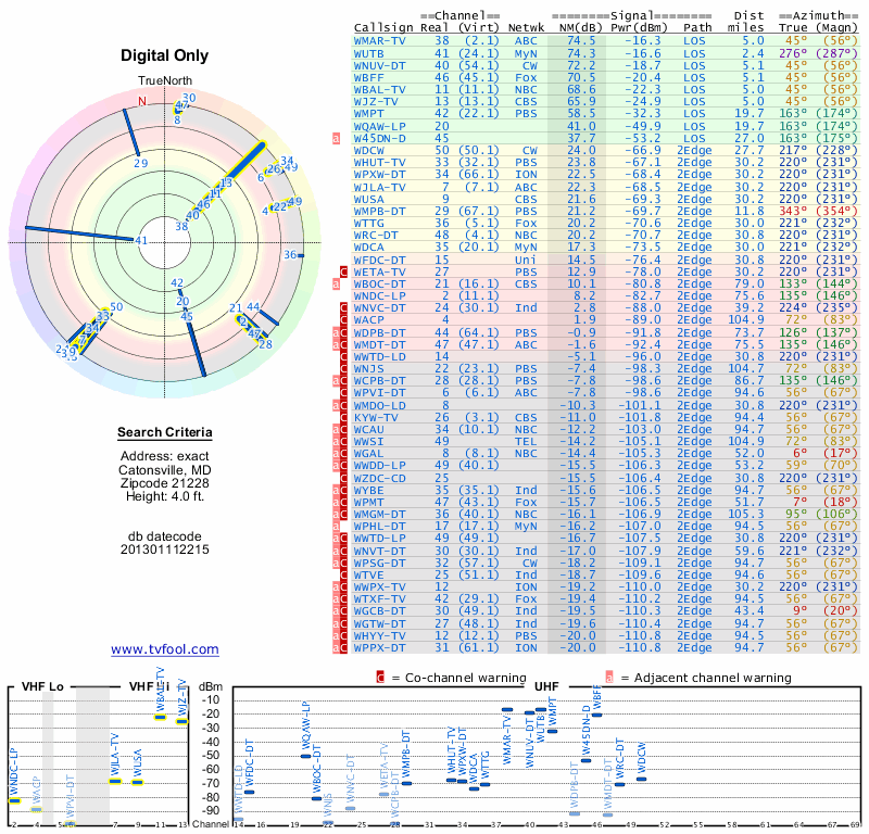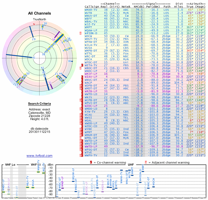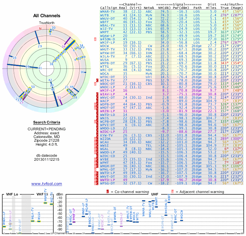 Here are the results for your location. The transmitter database was last updated on June 7, 2013. For more information about these plots and how to interpret them, please check out the Signal Analysis FAQ.