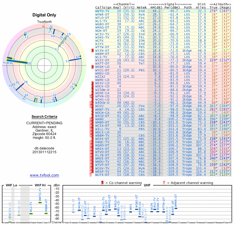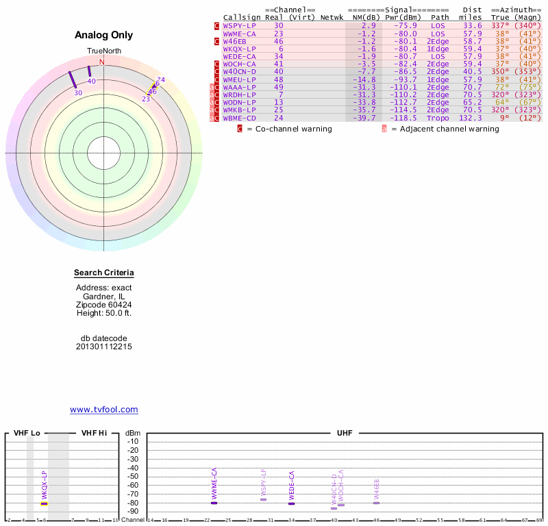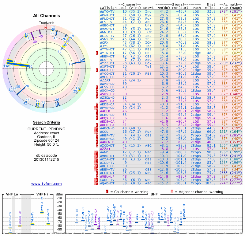 Here are the results for your location. The transmitter database was last updated on June 7, 2013. For more information about these plots and how to interpret them, please check out the Signal Analysis FAQ.