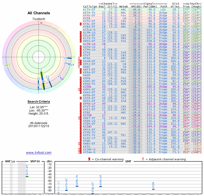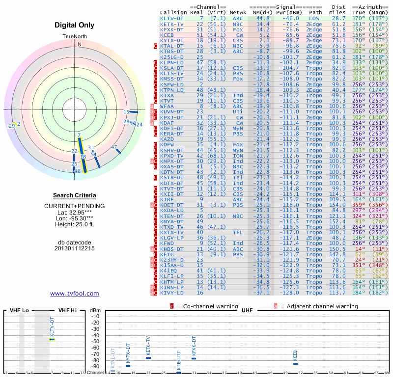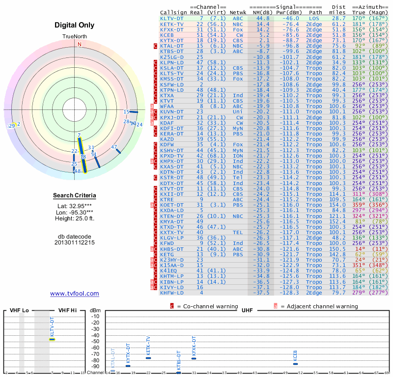 Here are the results for your location. The transmitter database was last updated on June 7, 2013. For more information about these plots and how to interpret them, please check out the Signal Analysis FAQ.
