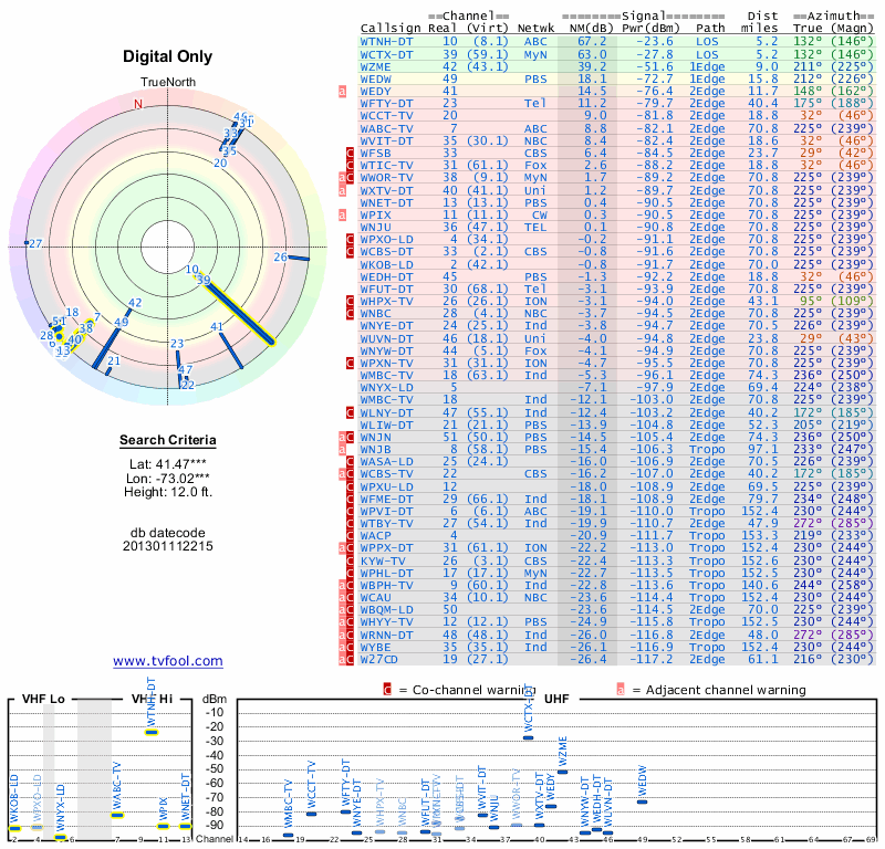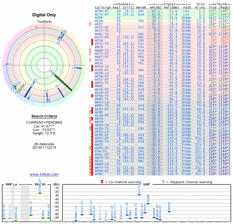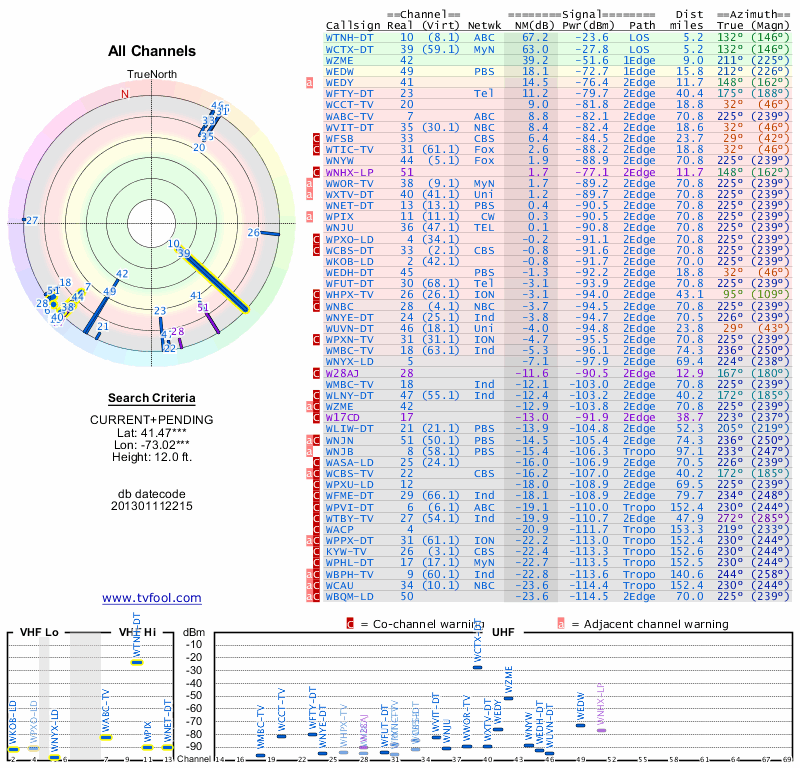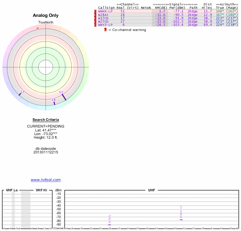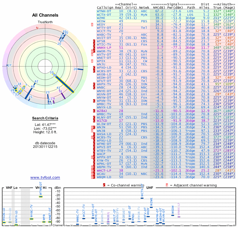 Here are the results for your location. The transmitter database was last updated on June 7, 2013. For more information about these plots and how to interpret them, please check out the Signal Analysis FAQ.