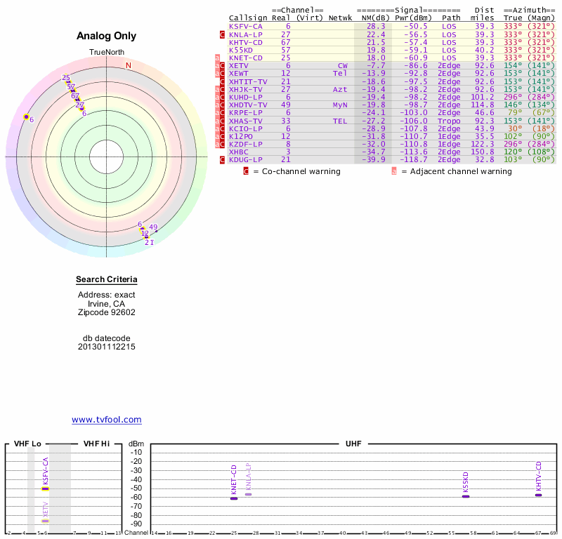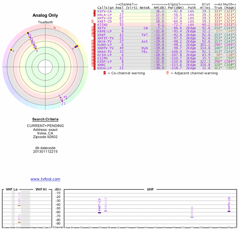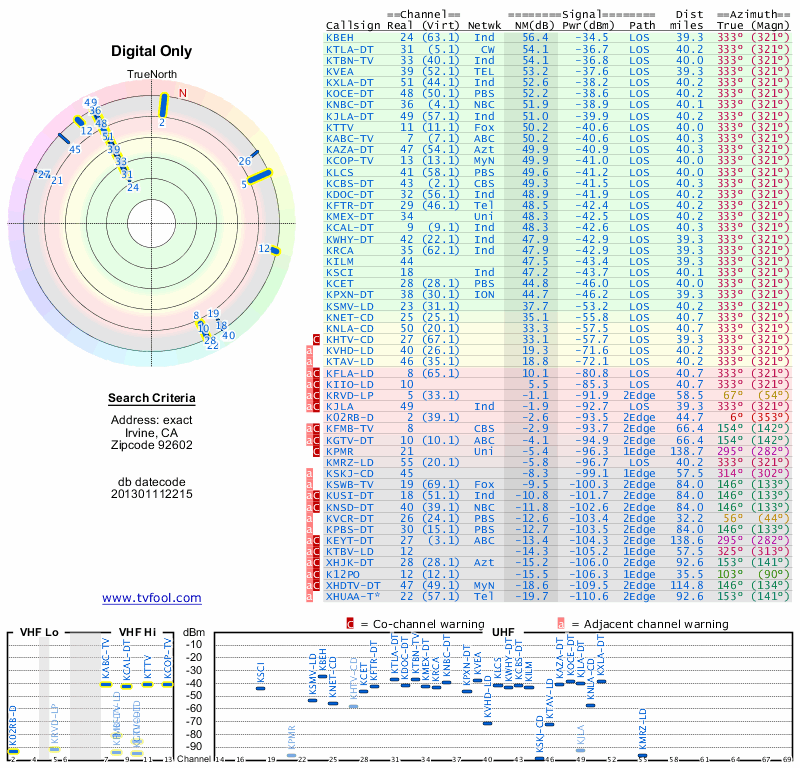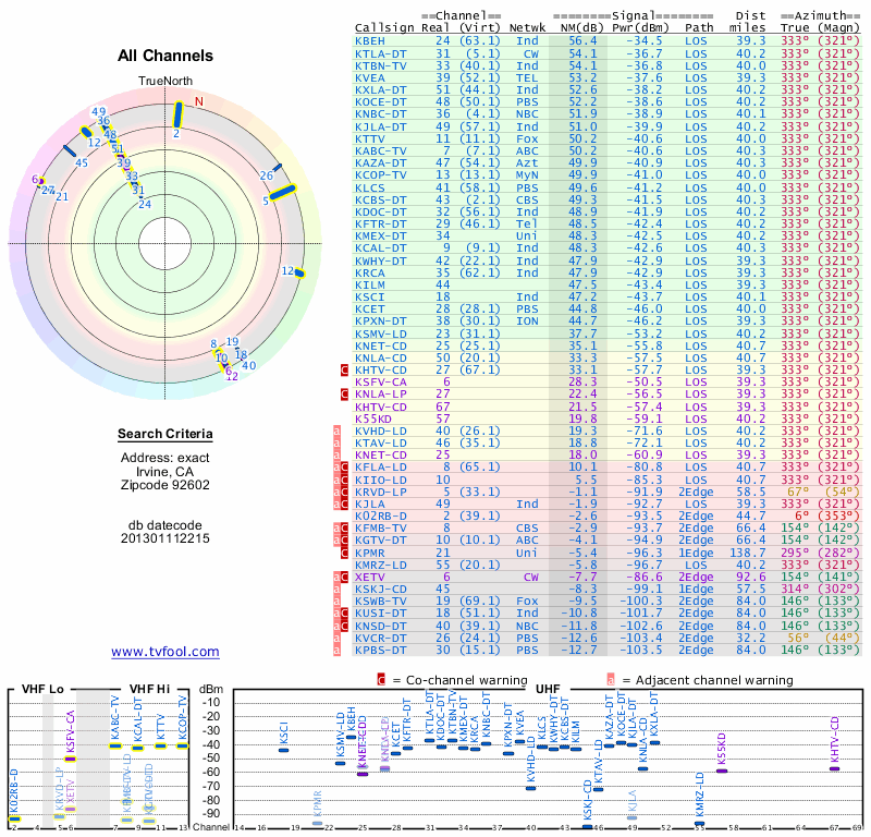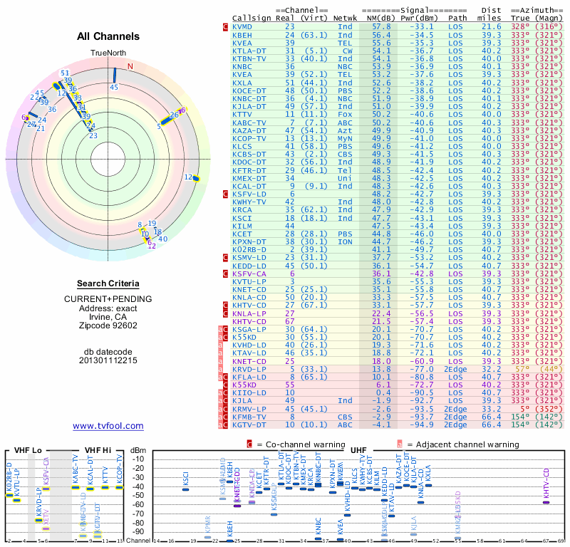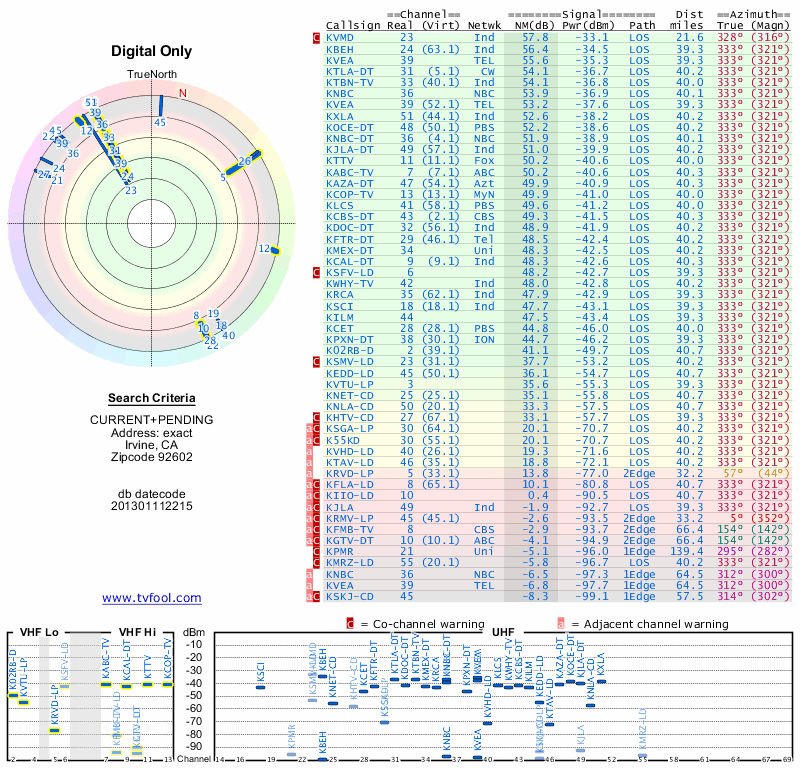 Here are the results for your location. The transmitter database was last updated on June 7, 2013. For more information about these plots and how to interpret them, please check out the Signal Analysis FAQ.
