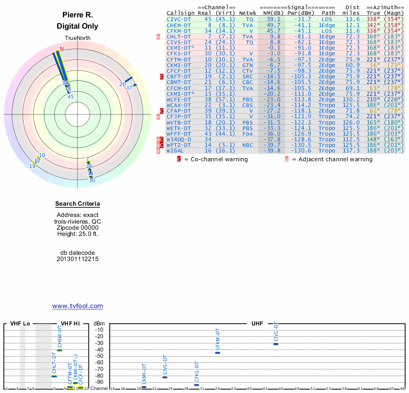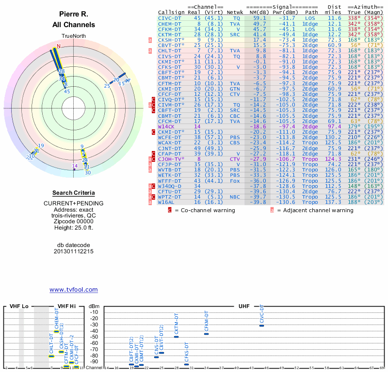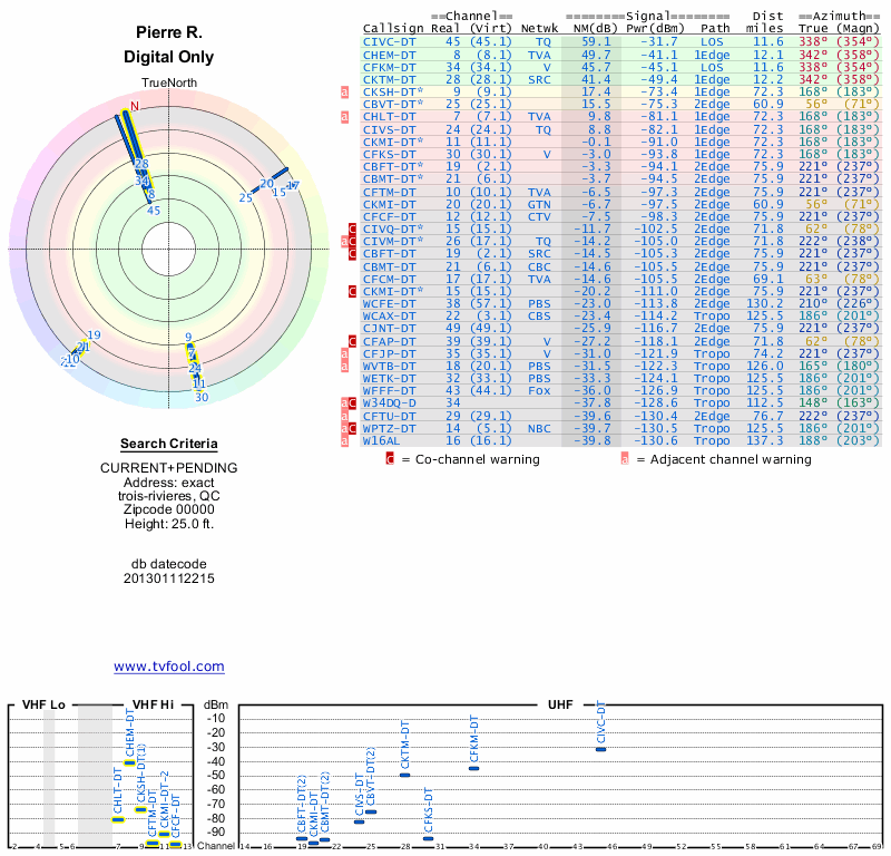 Here are the results for your location. The transmitter database was last updated on June 7, 2013. For more information about these plots and how to interpret them, please check out the Signal Analysis FAQ.
