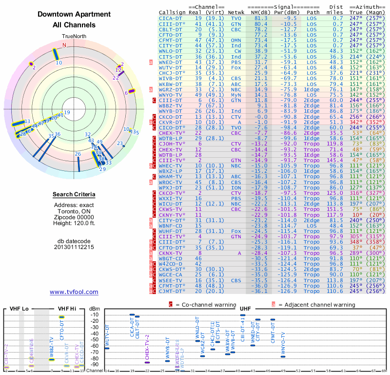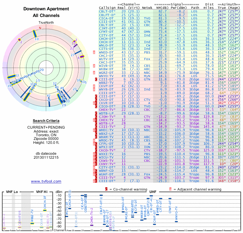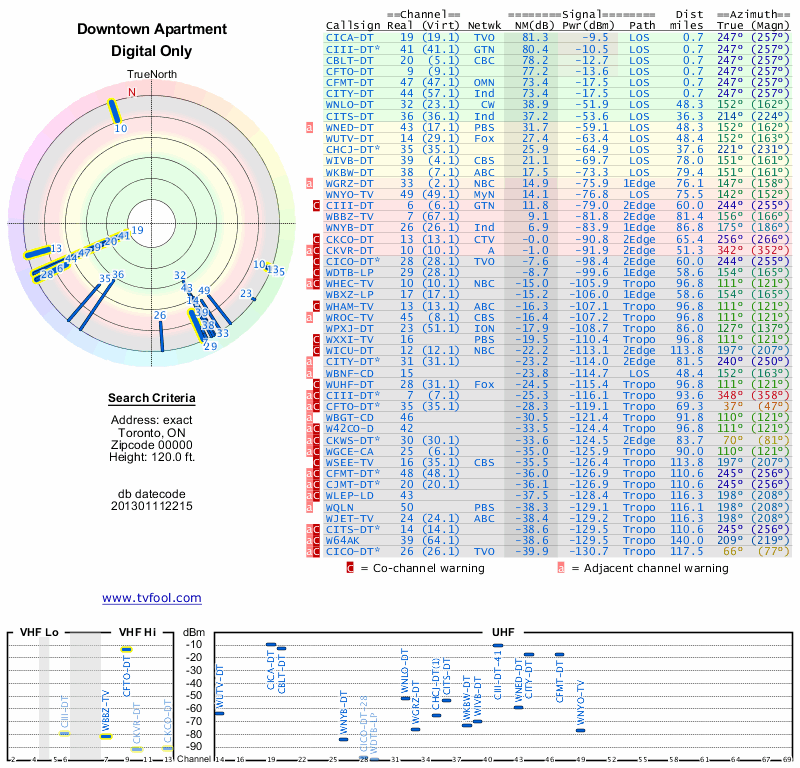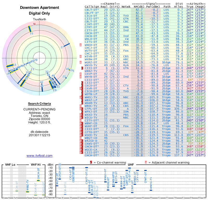 Here are the results for your location. The transmitter database was last updated on June 7, 2013. For more information about these plots and how to interpret them, please check out the Signal Analysis FAQ.