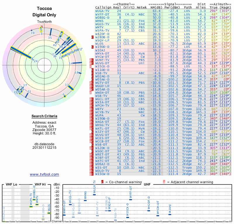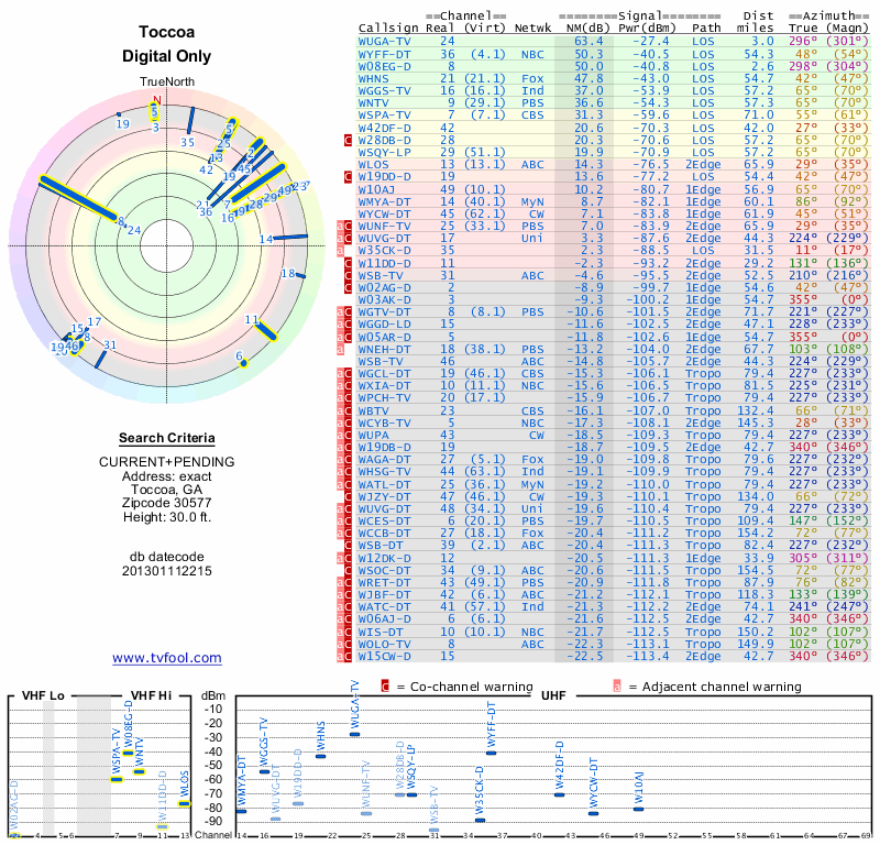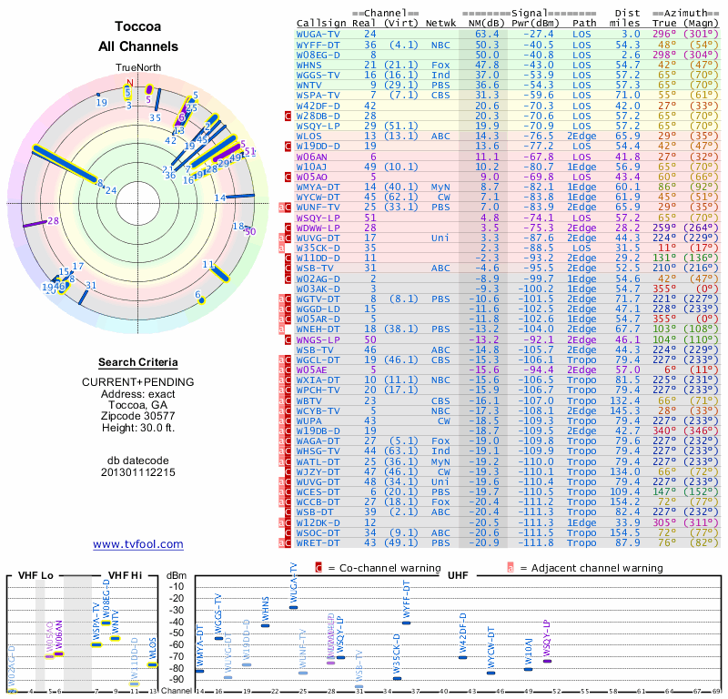 Here are the results for your location. The transmitter database was last updated on June 7, 2013. For more information about these plots and how to interpret them, please check out the Signal Analysis FAQ.
