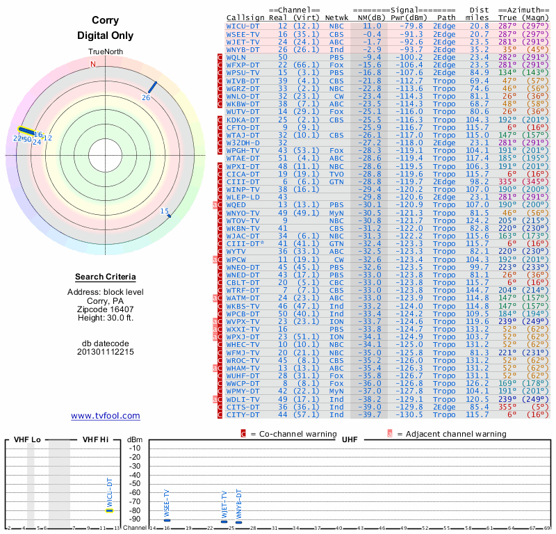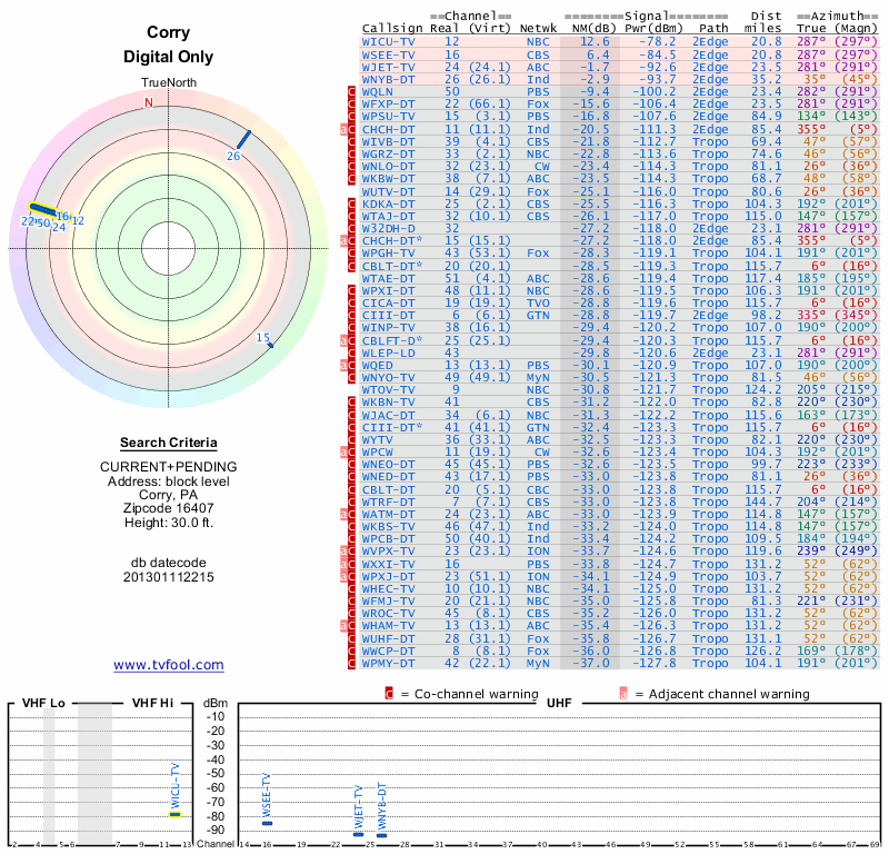 Here are the results for your location. The transmitter database was last updated on June 7, 2013. For more information about these plots and how to interpret them, please check out the Signal Analysis FAQ.