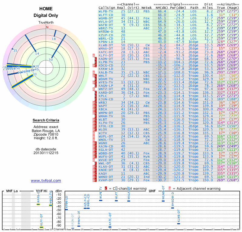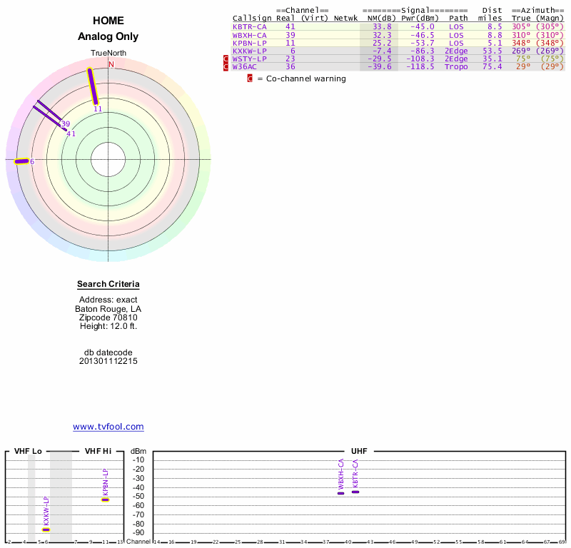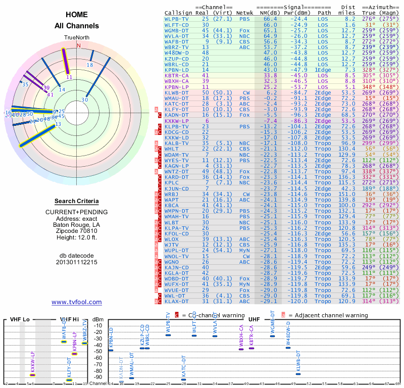 Here are the results for your location. The transmitter database was last updated on June 7, 2013. For more information about these plots and how to interpret them, please check out the Signal Analysis FAQ.