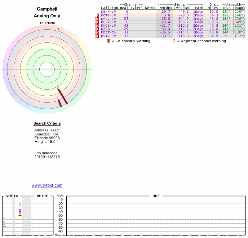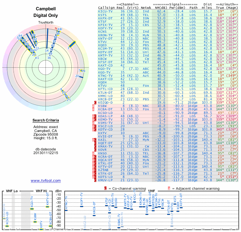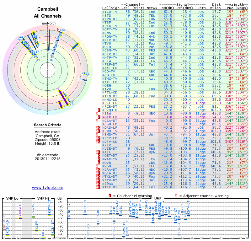 Here are the results for your location. The transmitter database was last updated on June 7, 2013. For more information about these plots and how to interpret them, please check out the Signal Analysis FAQ.