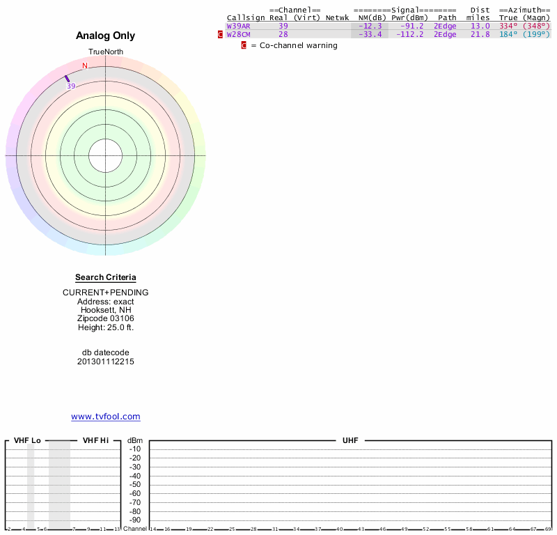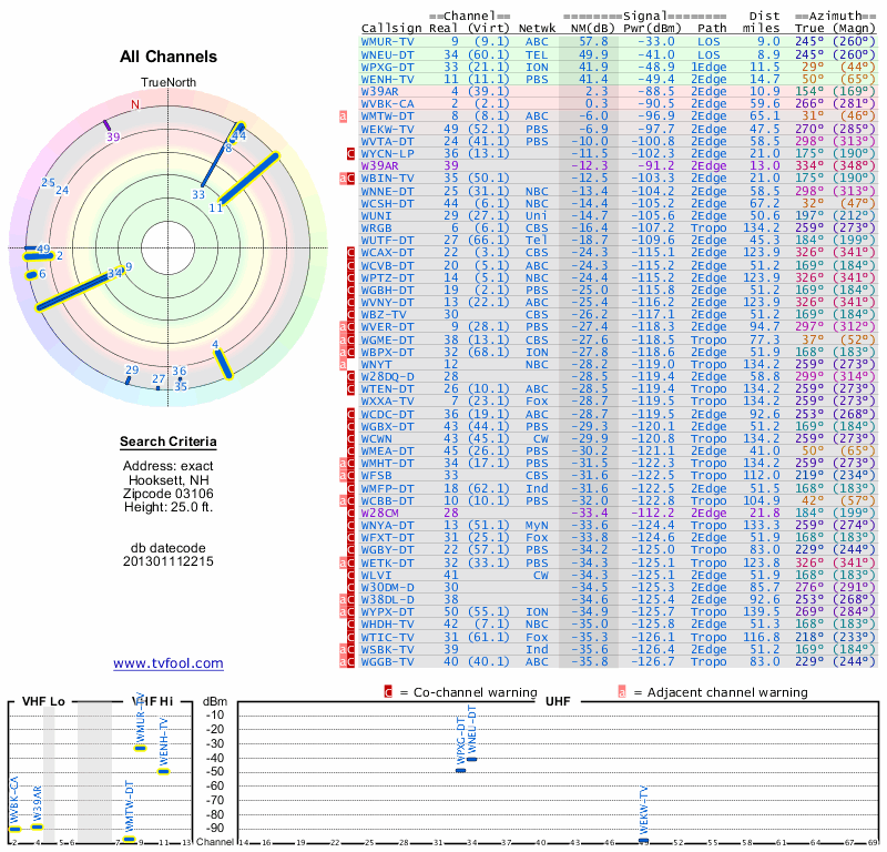 Here are the results for your location. The transmitter database was last updated on June 7, 2013. For more information about these plots and how to interpret them, please check out the Signal Analysis FAQ.
