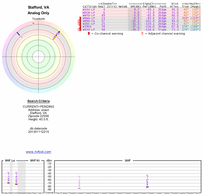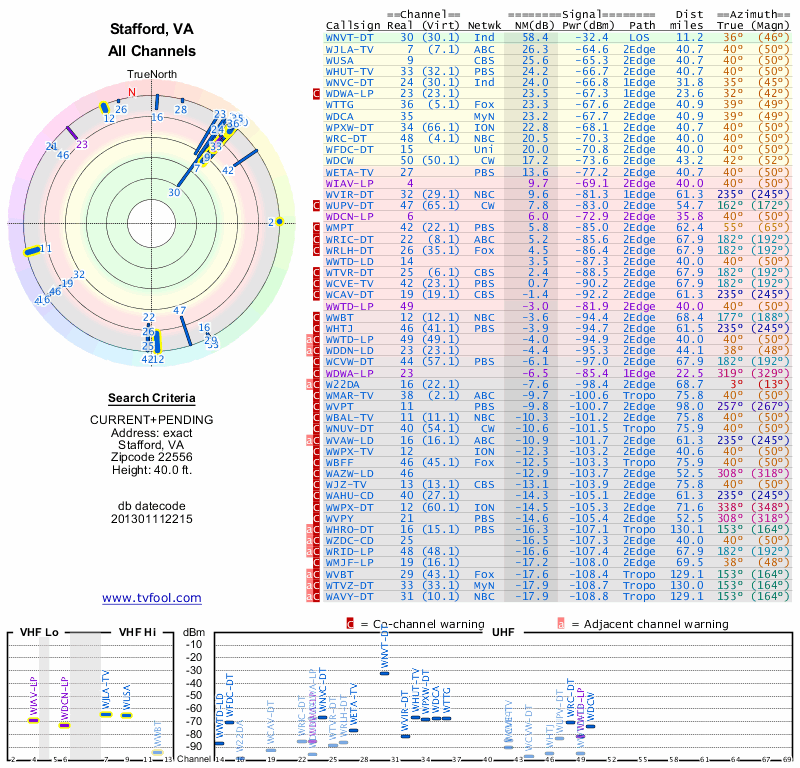 Here are the results for your location. The transmitter database was last updated on June 7, 2013. For more information about these plots and how to interpret them, please check out the Signal Analysis FAQ.