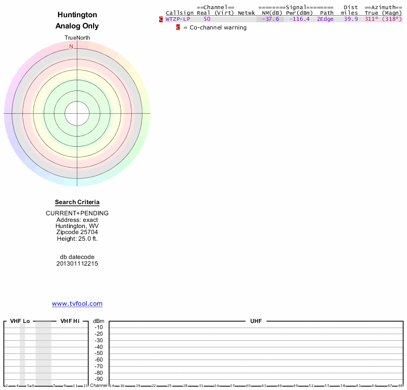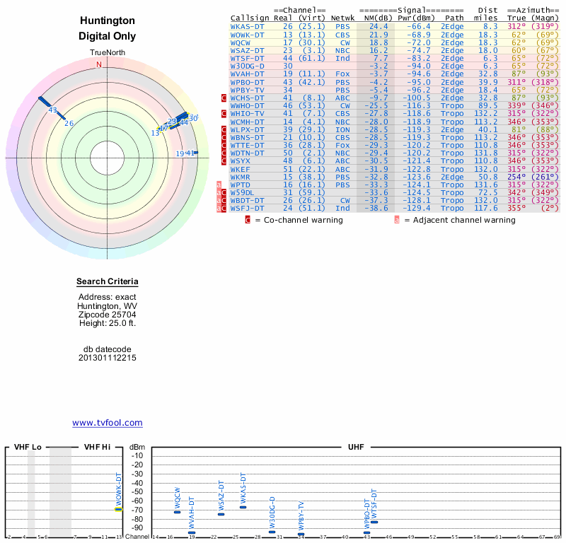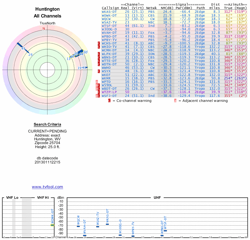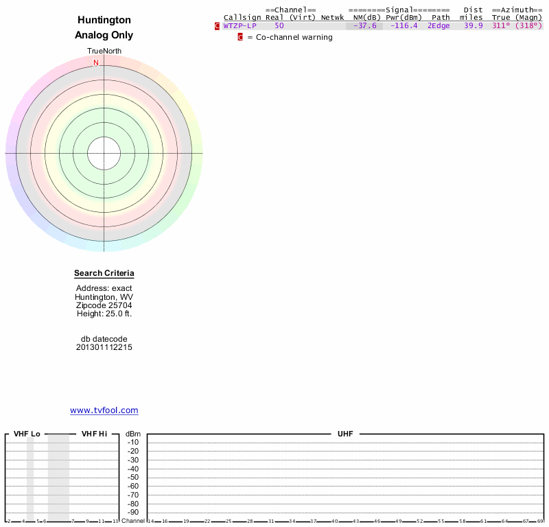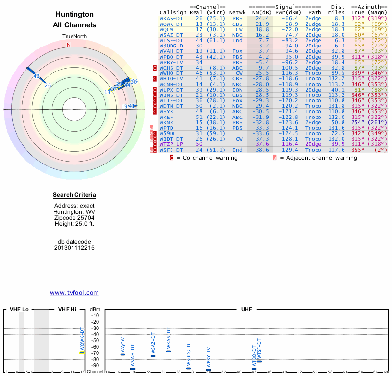 Here are the results for your location. The transmitter database was last updated on June 7, 2013. For more information about these plots and how to interpret them, please check out the Signal Analysis FAQ.