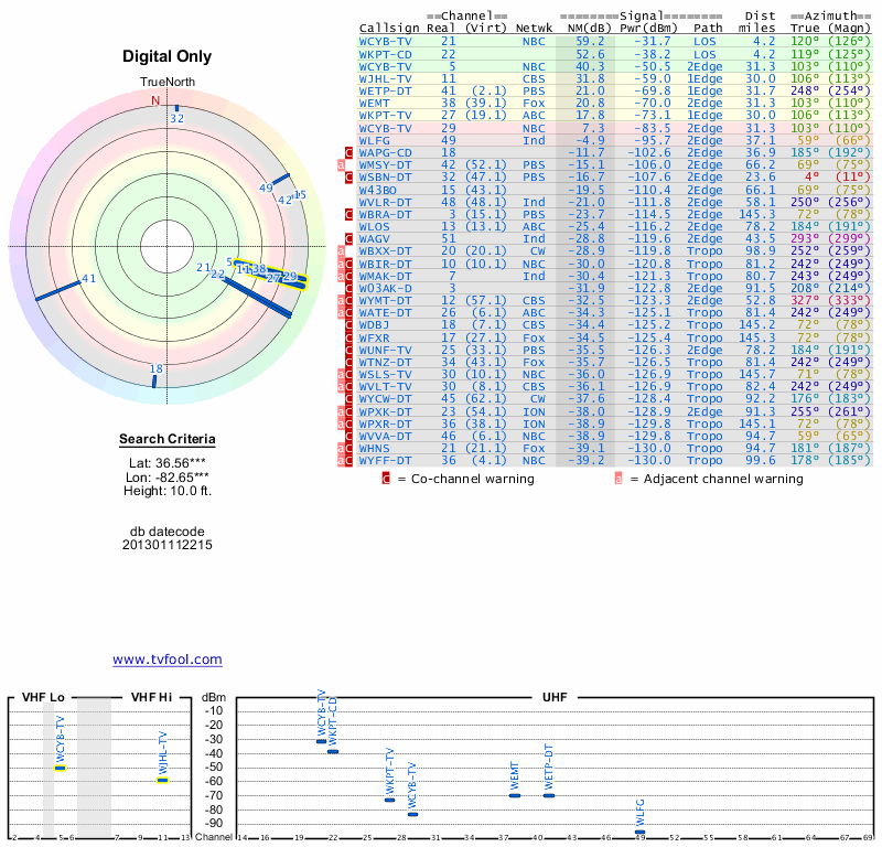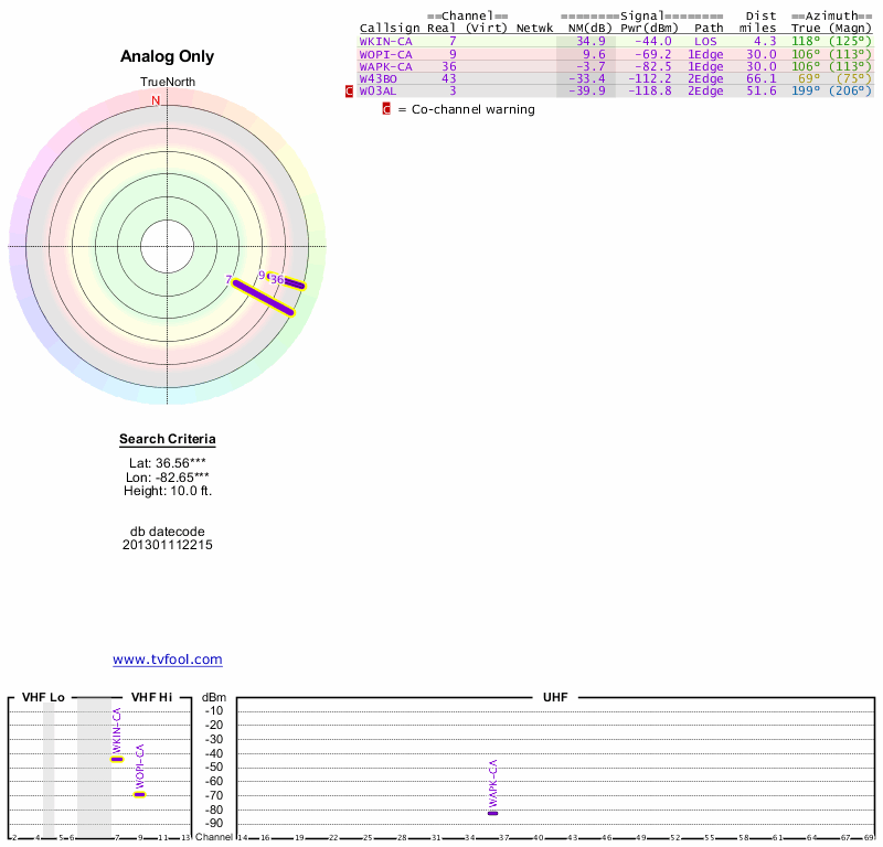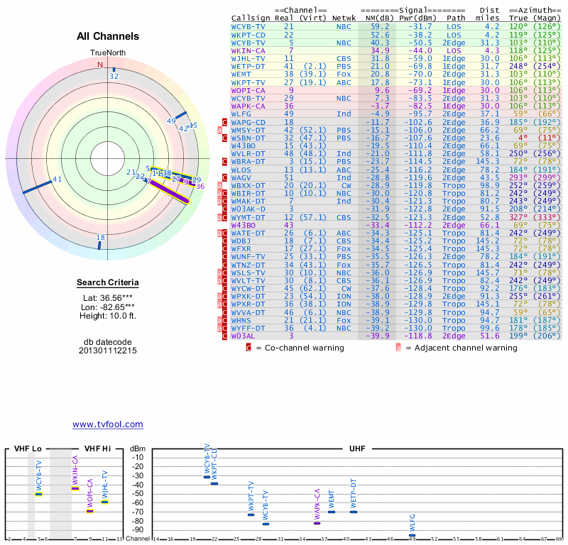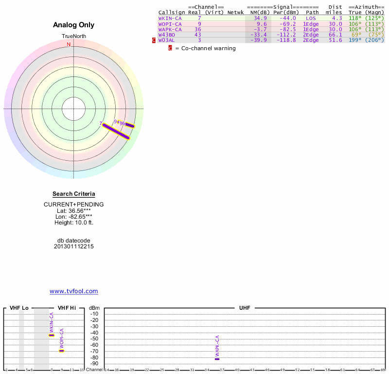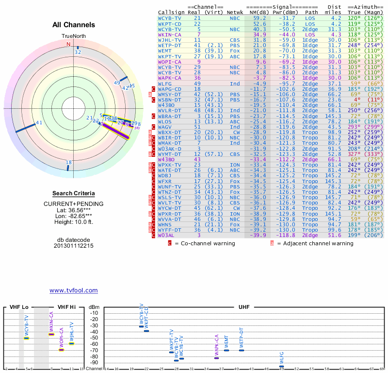 Here are the results for your location. The transmitter database was last updated on June 7, 2013. For more information about these plots and how to interpret them, please check out the Signal Analysis FAQ.
