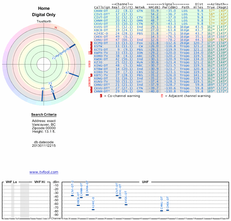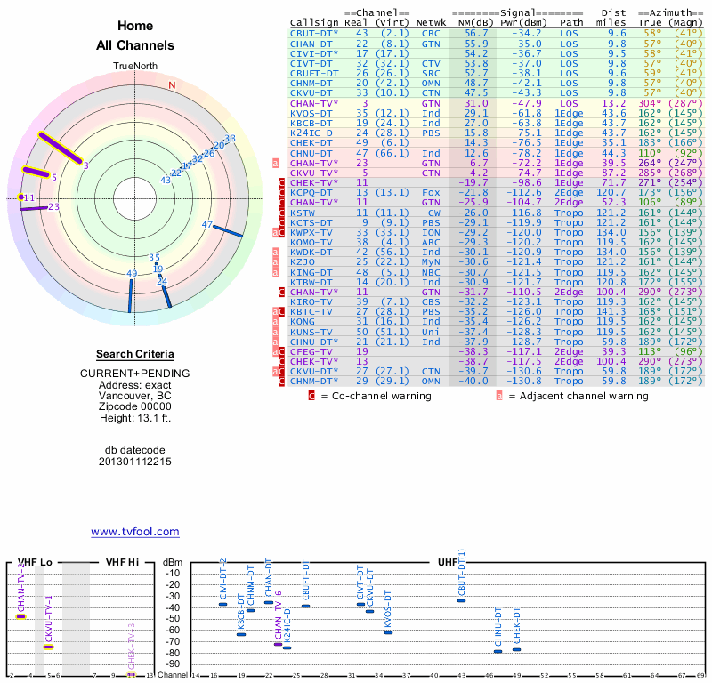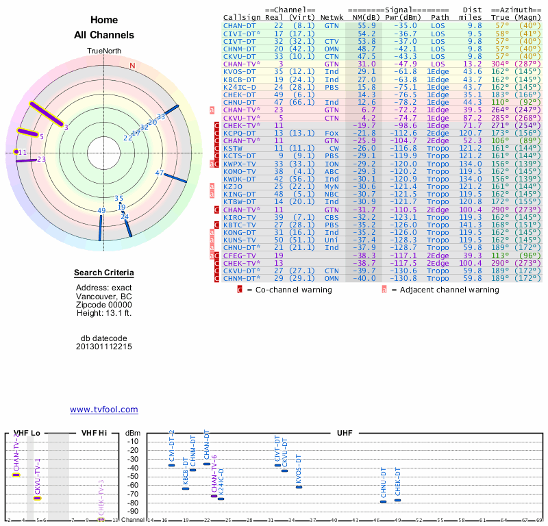 Here are the results for your location. The transmitter database was last updated on June 7, 2013. For more information about these plots and how to interpret them, please check out the Signal Analysis FAQ.