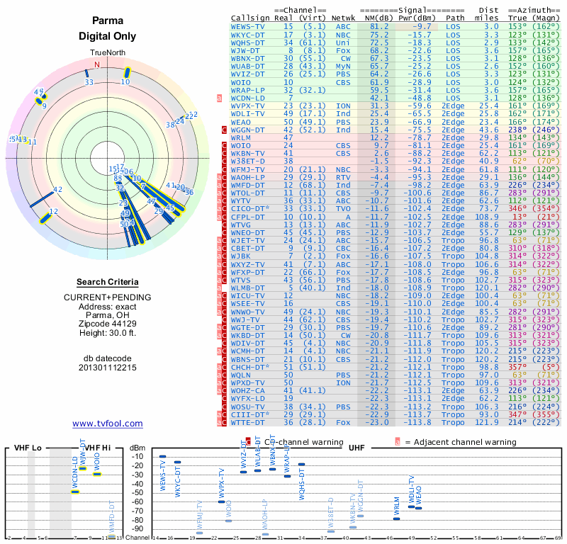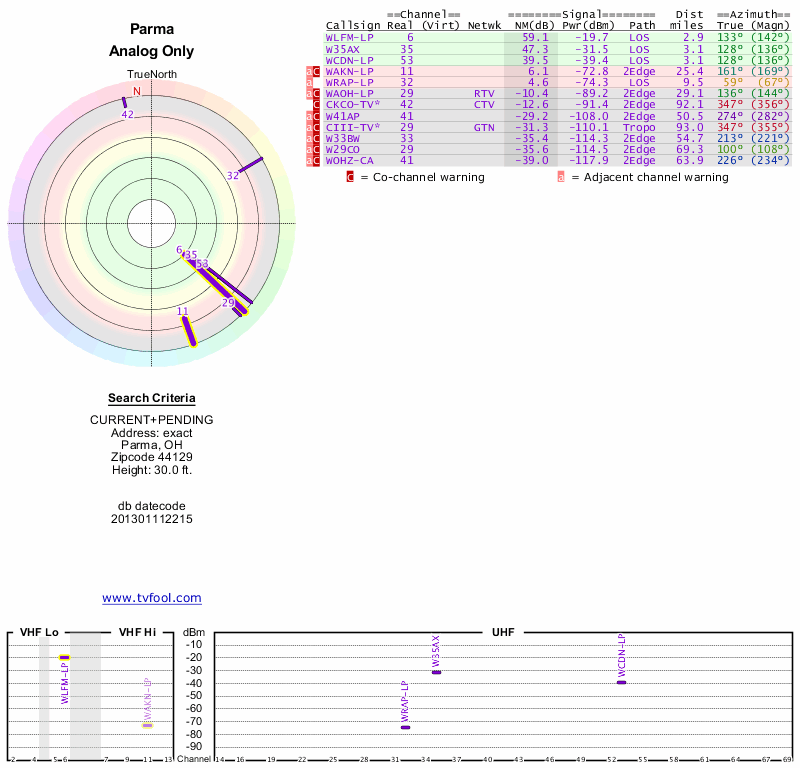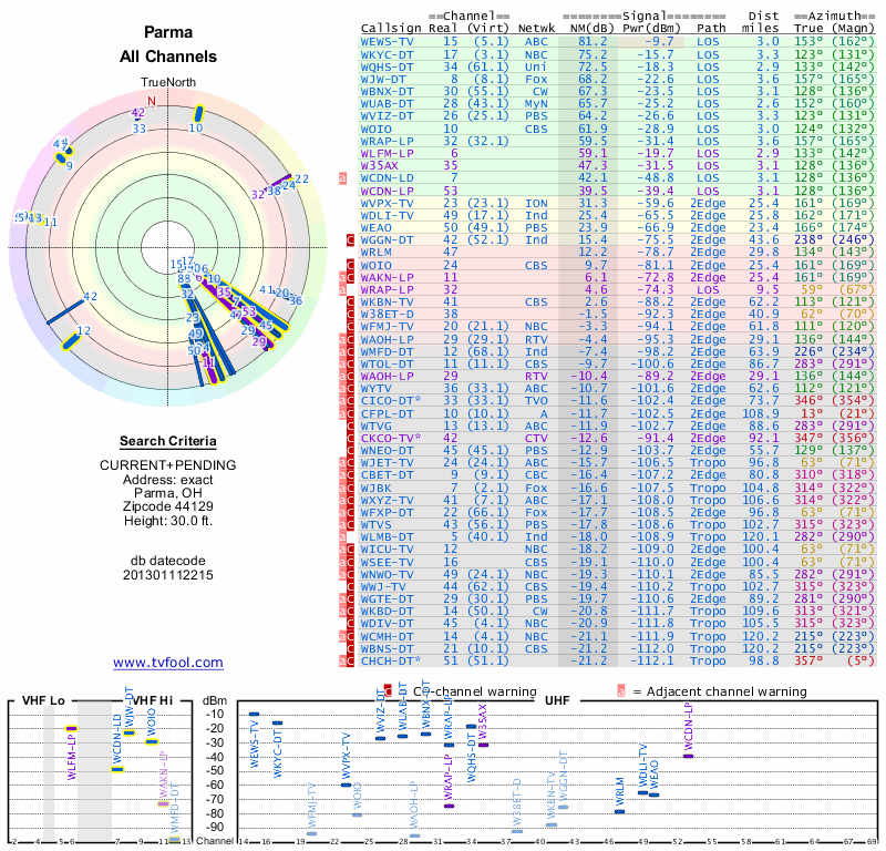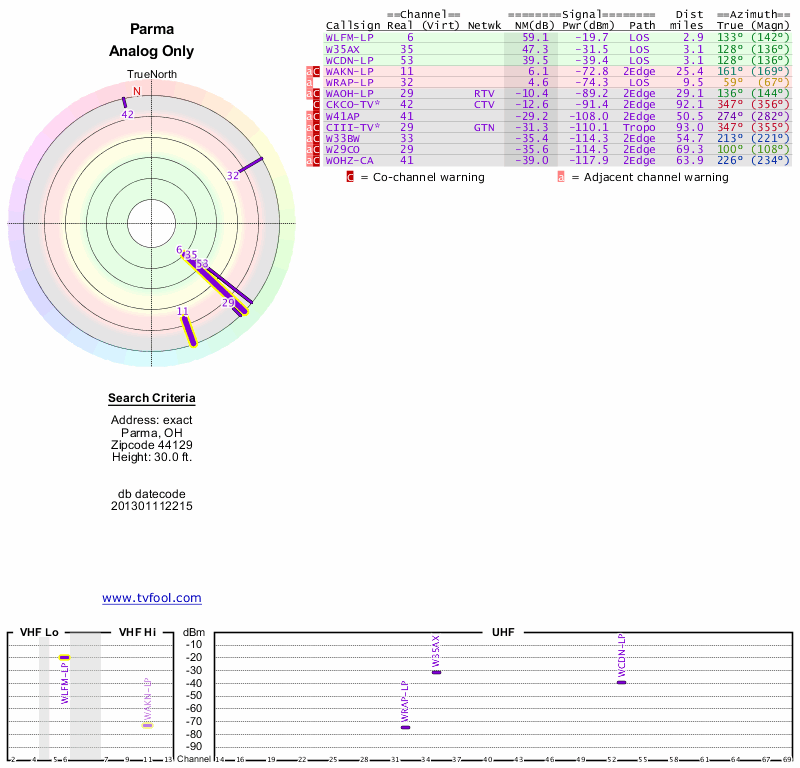 Here are the results for your location. The transmitter database was last updated on June 7, 2013. For more information about these plots and how to interpret them, please check out the Signal Analysis FAQ.