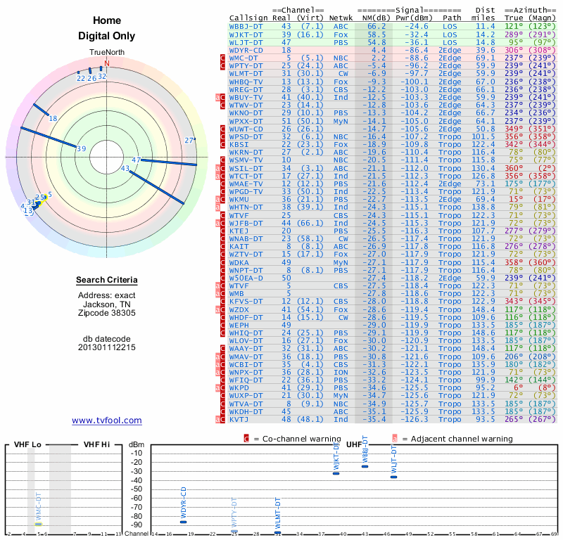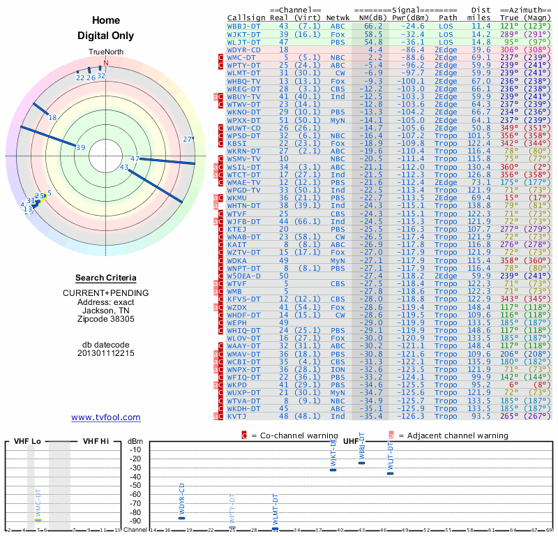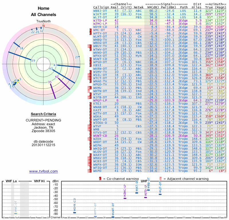 Here are the results for your location. The transmitter database was last updated on June 7, 2013. For more information about these plots and how to interpret them, please check out the Signal Analysis FAQ.