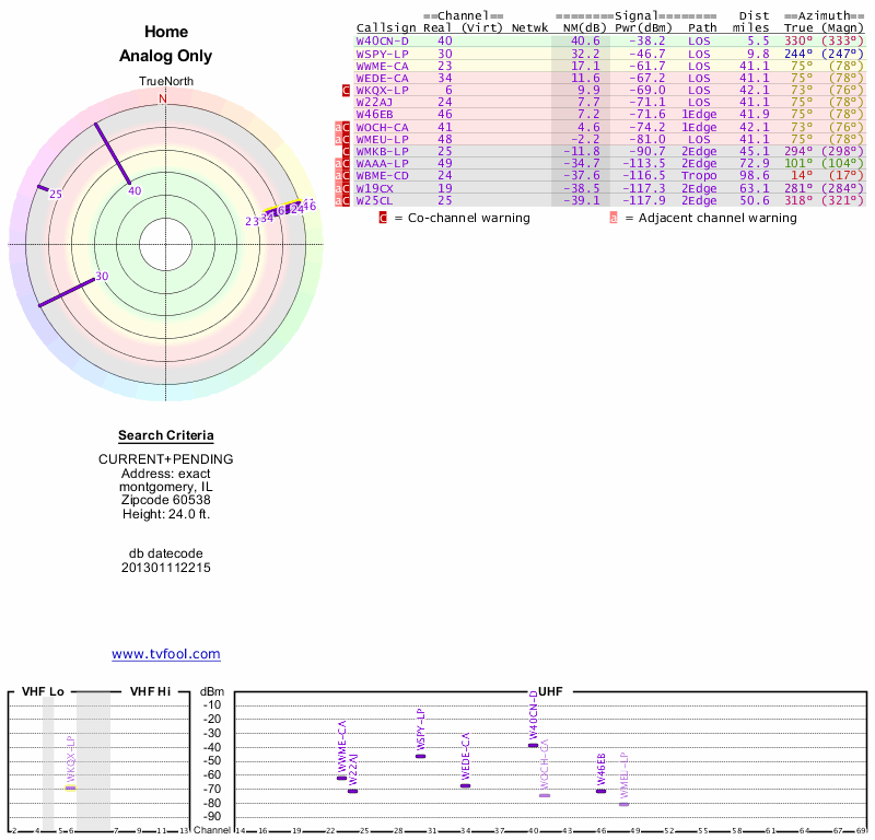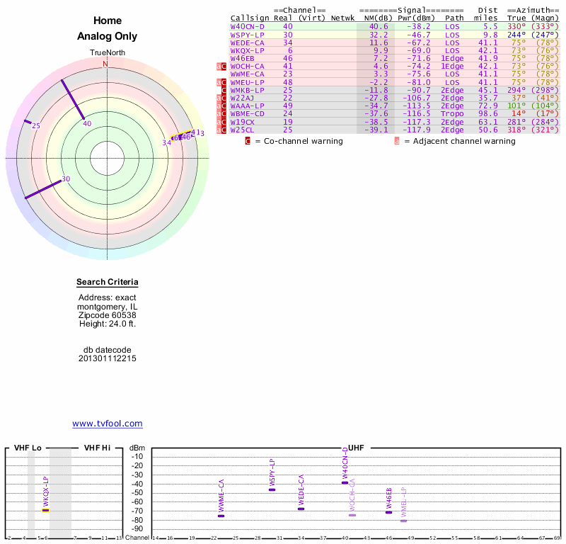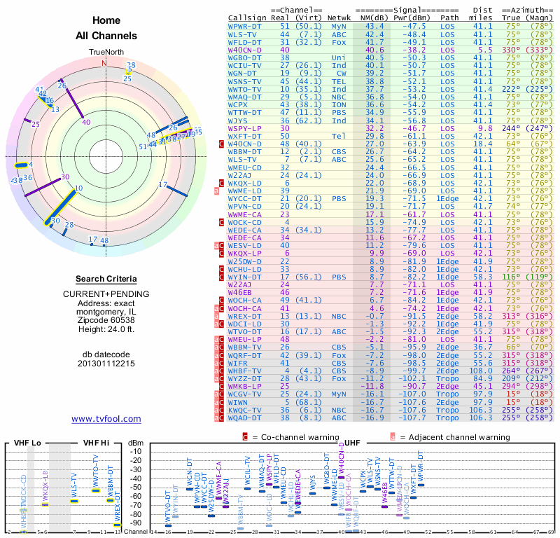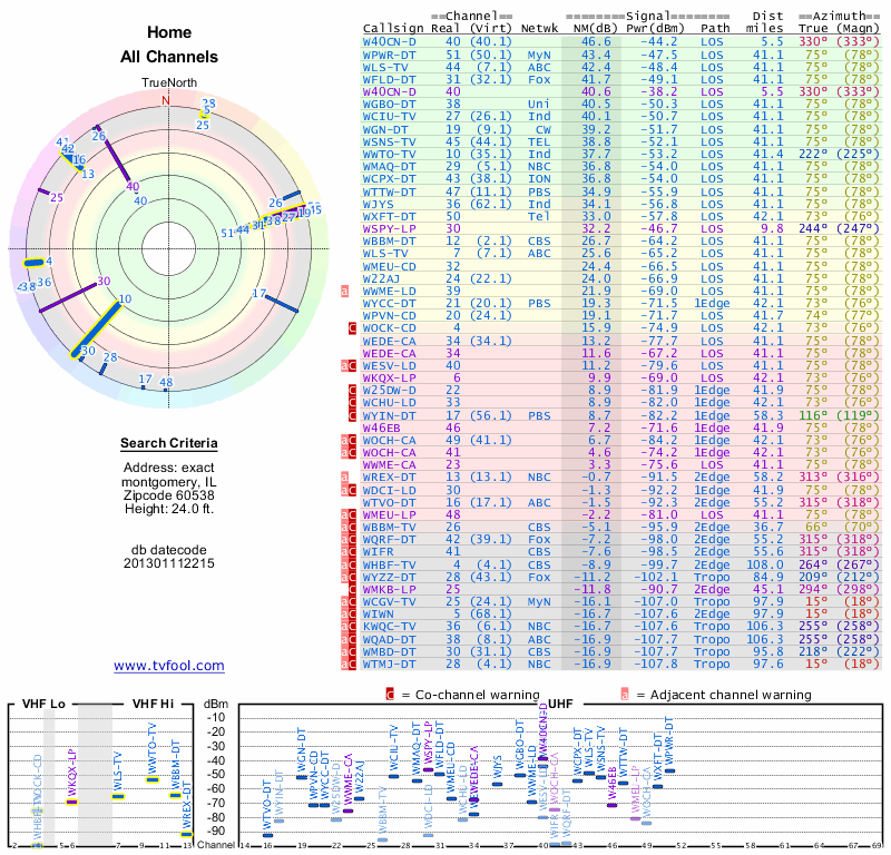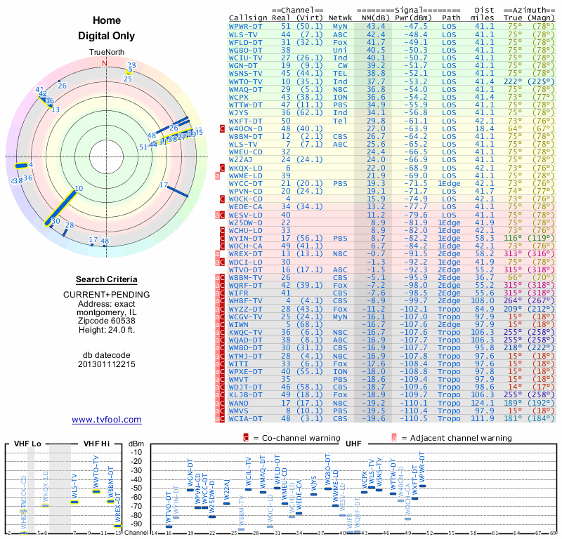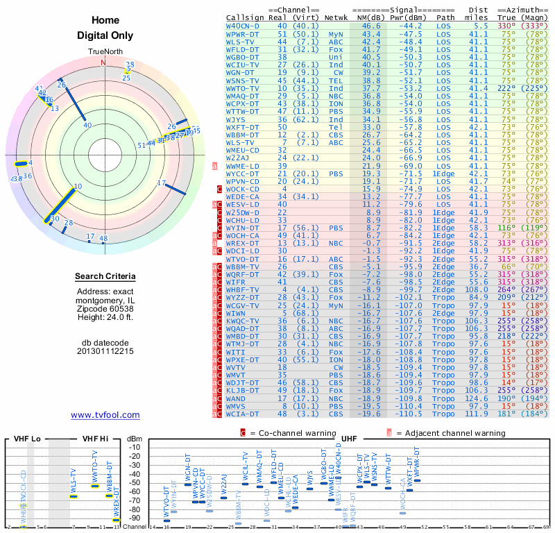 Here are the results for your location. The transmitter database was last updated on June 7, 2013. For more information about these plots and how to interpret them, please check out the Signal Analysis FAQ.