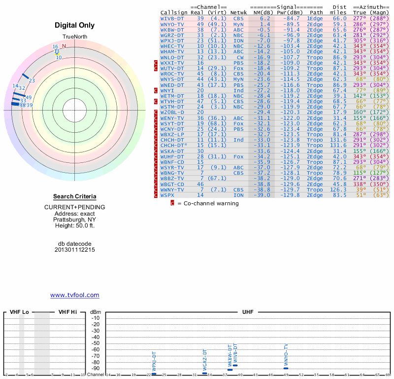 Here are the results for your location. The transmitter database was last updated on June 7, 2013. For more information about these plots and how to interpret them, please check out the Signal Analysis FAQ.