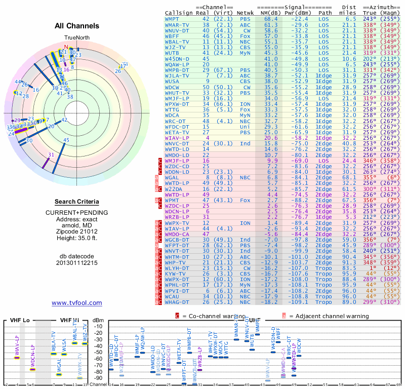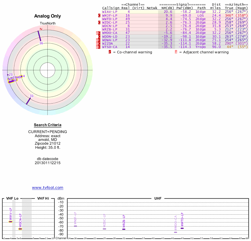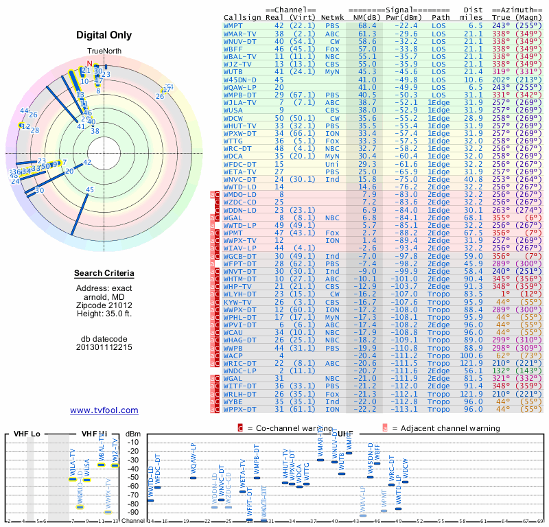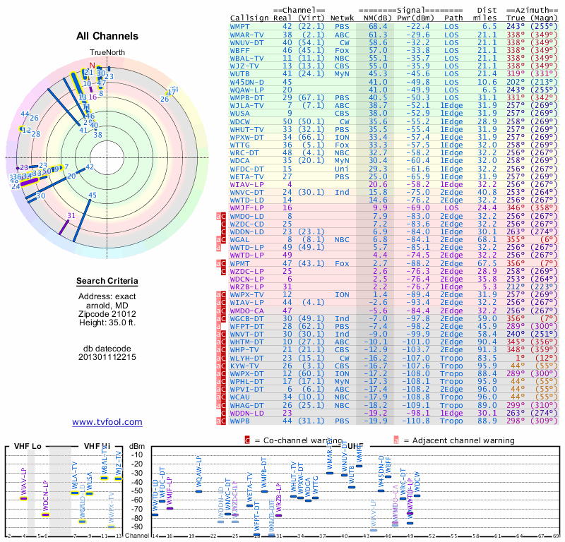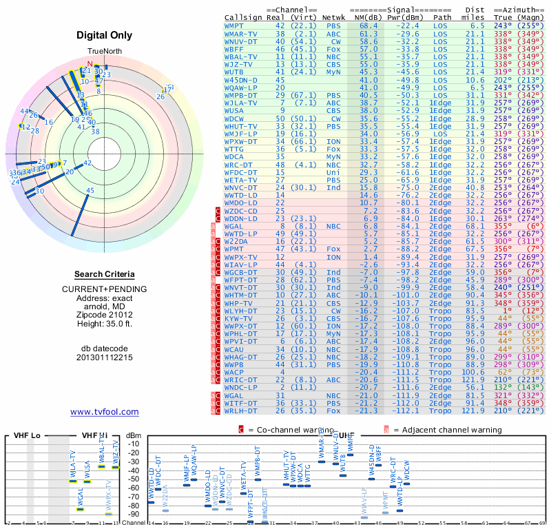 Here are the results for your location. The transmitter database was last updated on June 7, 2013. For more information about these plots and how to interpret them, please check out the Signal Analysis FAQ.