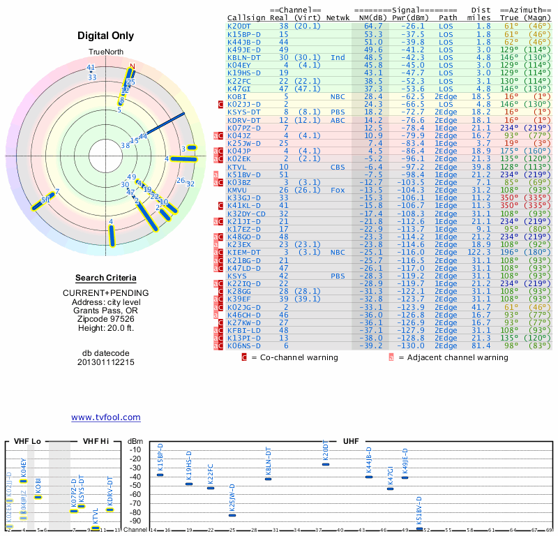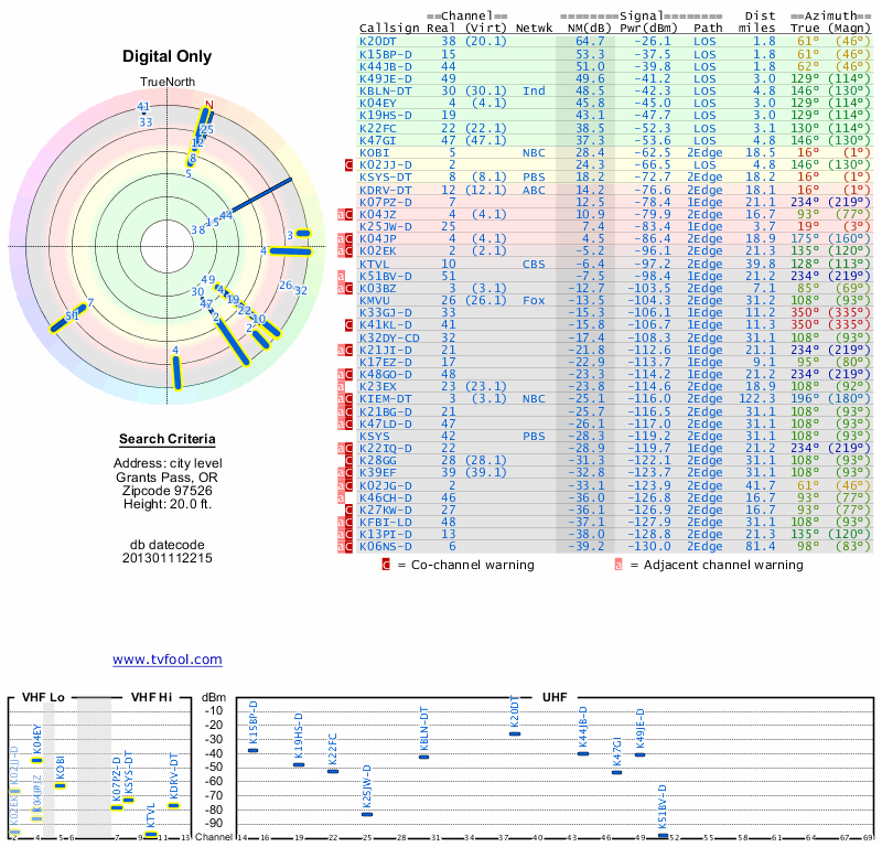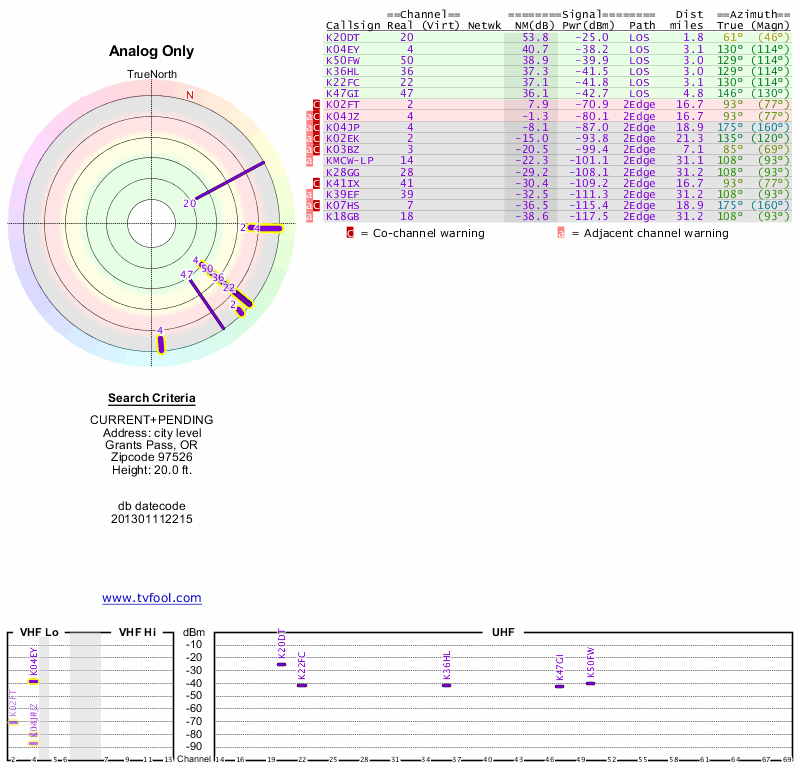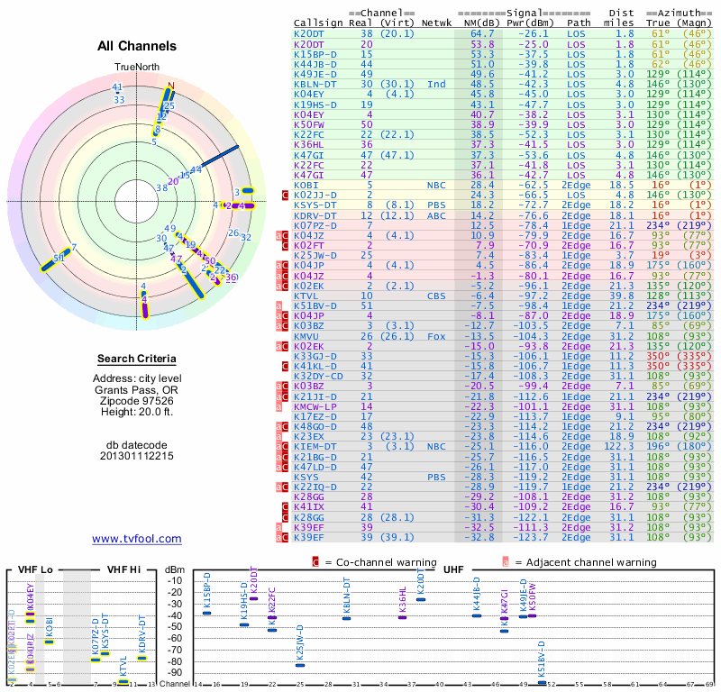 Here are the results for your location. The transmitter database was last updated on June 7, 2013. For more information about these plots and how to interpret them, please check out the Signal Analysis FAQ.