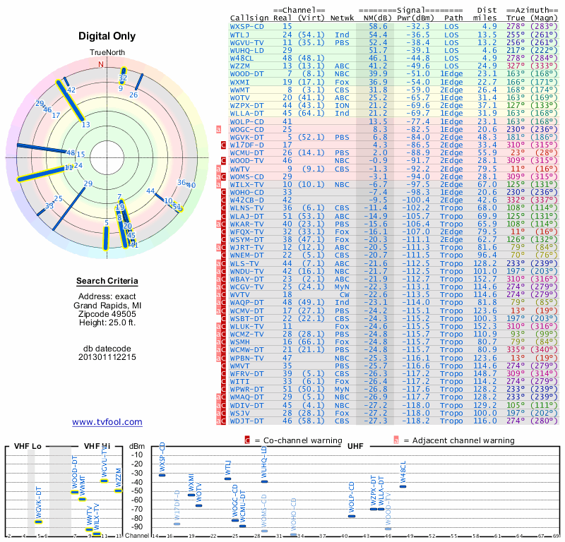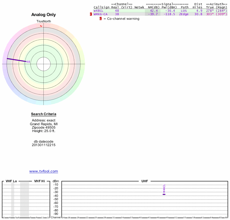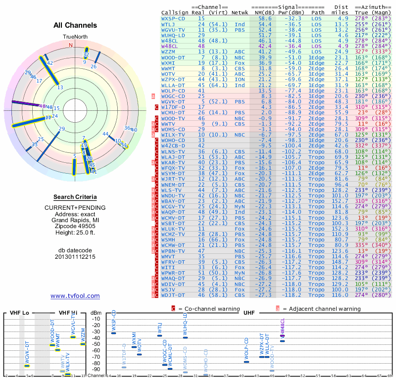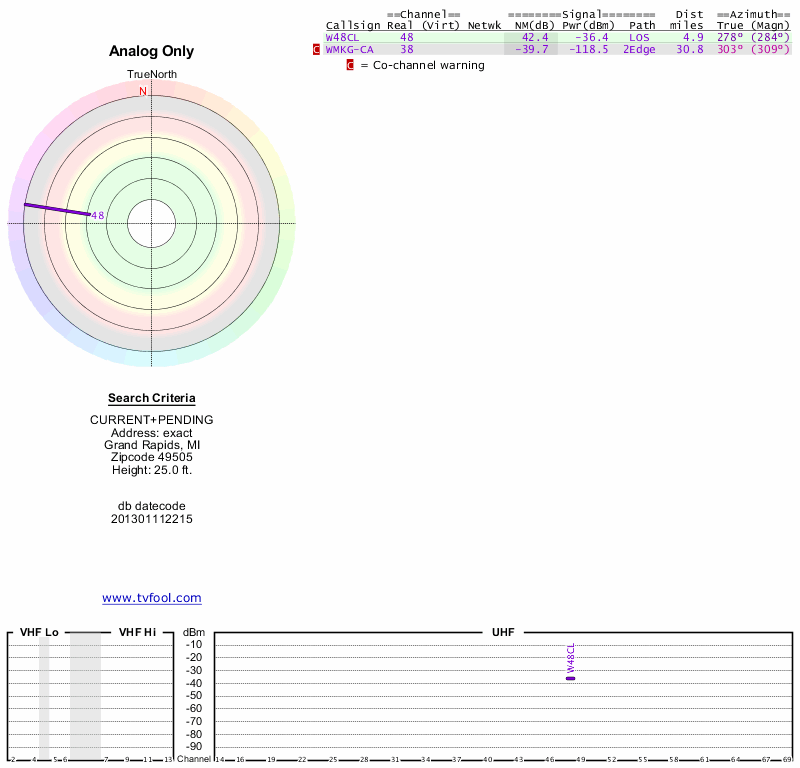 Here are the results for your location. The transmitter database was last updated on June 7, 2013. For more information about these plots and how to interpret them, please check out the Signal Analysis FAQ.